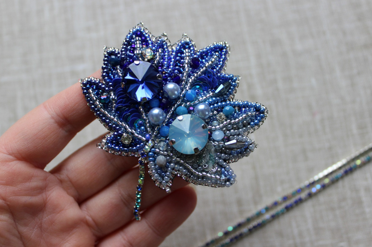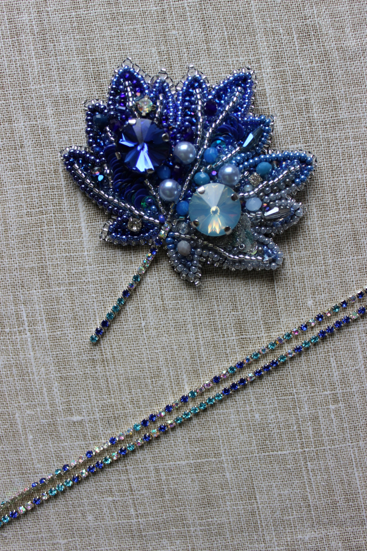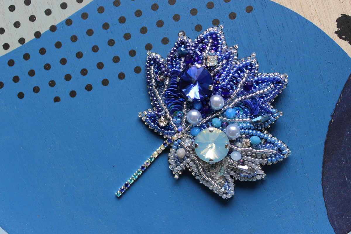 По просьбе трудящихся сделала такую брошь. Основные требования: форма — лист клена, цвет — переход из голубого в серый. Для контраста добавила еще и синий, потому что голубой и серый практически сливались бы в одну массу. Вот такой необычный лист получился.
