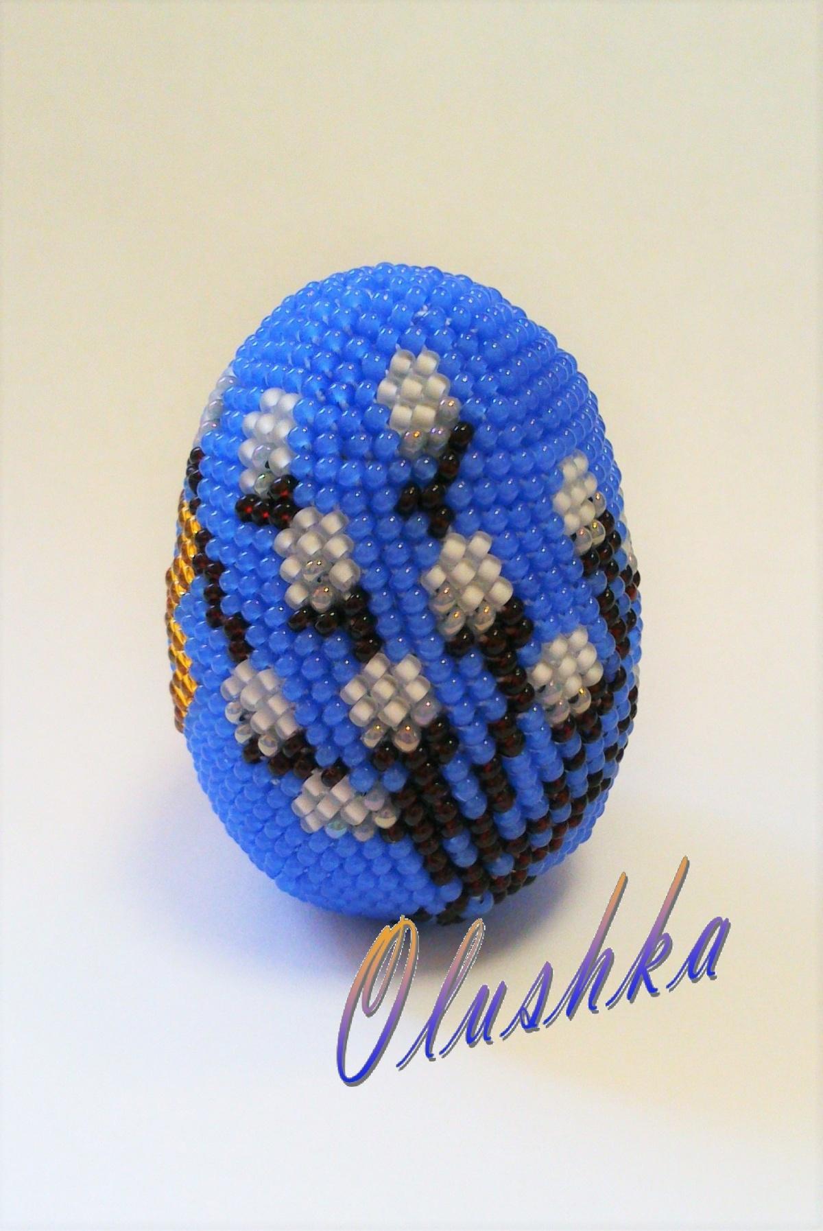Яичко пасхальное, вязаное. Небольшое, всего 48 бисерин по кругу. С одной стороны буковки, а остальное — пучок веточек вербы. Больше ничего не поместилось