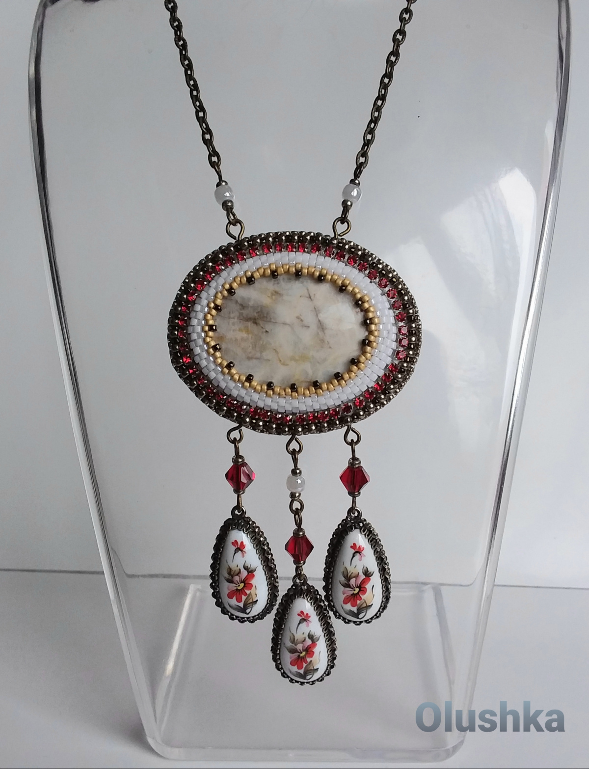 У беломорита присутствуют небольшие жёлтые и коричневые прожилки и у этой финифти такие цвета есть, плюс красная стразовая лента вокруг камешка и вот они вместе.