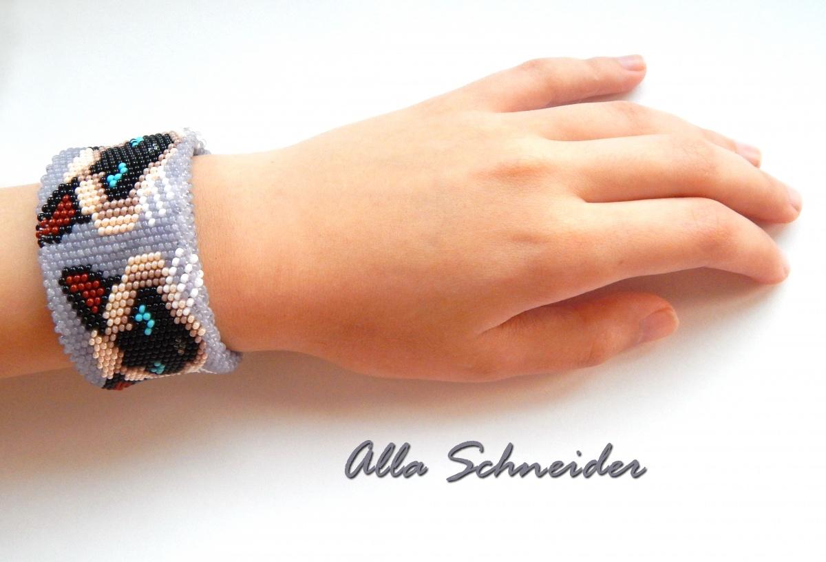 Широкий плоский браслет из бисера «The Cat». Мне, к сожалению, автор схемы не известен. 40 б. в окружности. Браслет рассчитан на тонкое запястье. Длина изделия вместе с замком 17,6 см (длина бисерной части 15,8 см). Ширина изделия 3,8 см. Металлическая магнитная фурнитура цвета «родий». Изображения кошек расположены только на лицевой стороне браслета. На внутренней стороне браслета рисунок не предусмотрен.