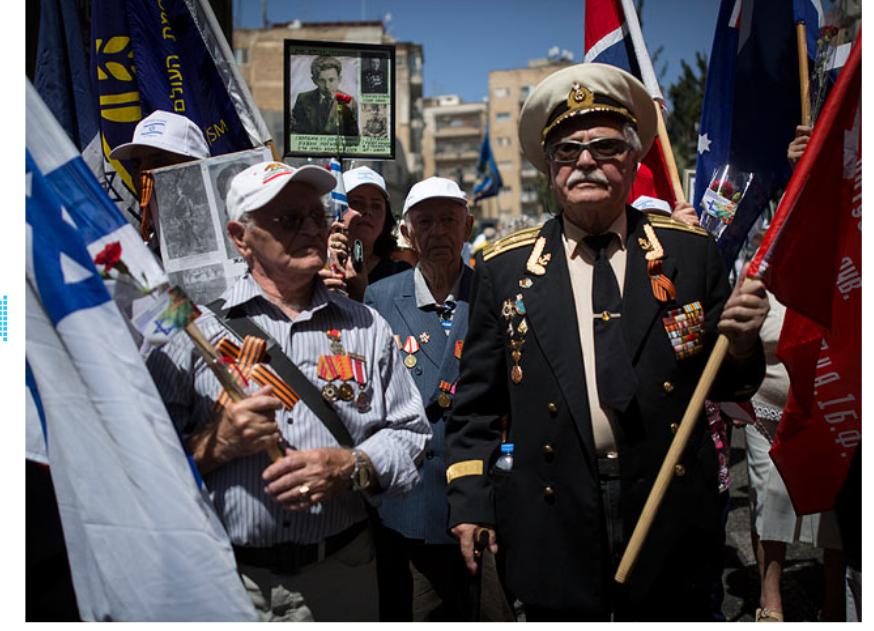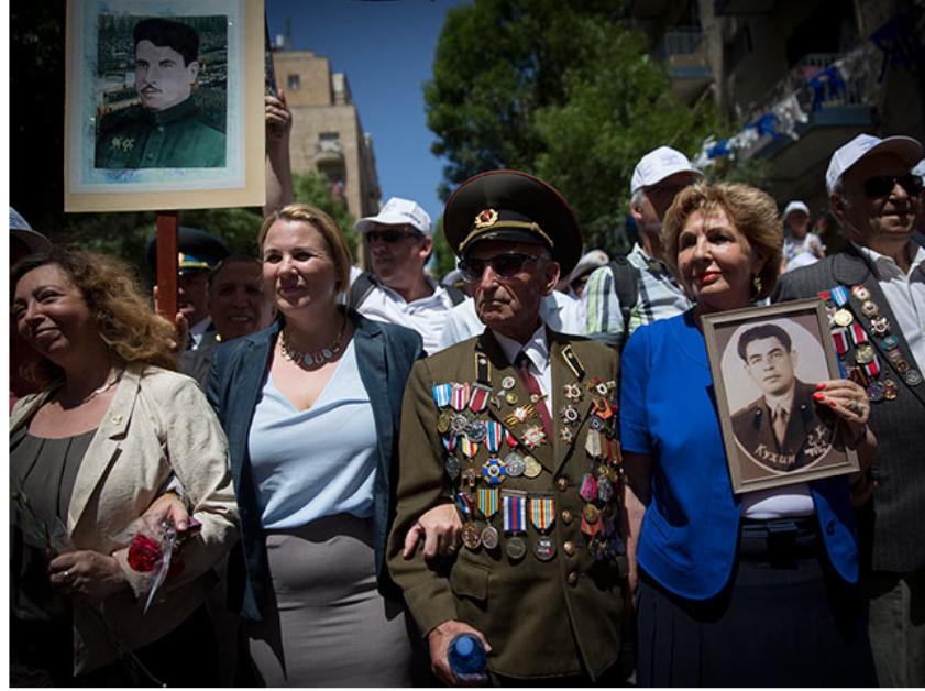 И у нас, в Иерусалиме, сегодня прошло шествие ветеранов, детей, переживших войну, детей и внуков воевавших. Свекровь моя наотрез отказалась от любых ленточек, поэтому получила вот это, с шарфиком.
