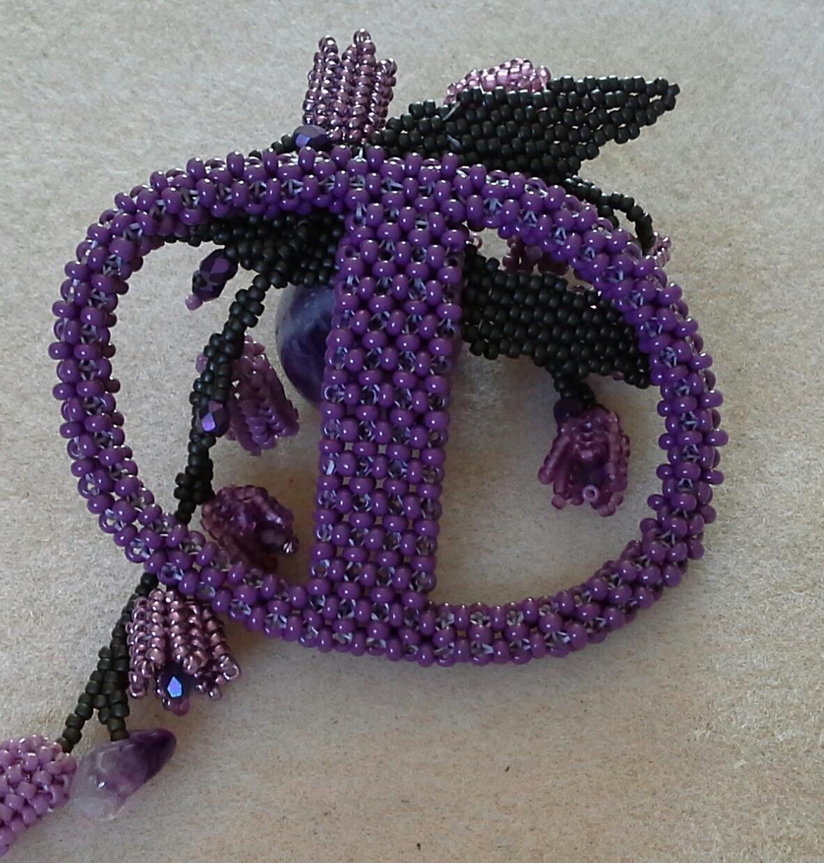 Носки пока ещё вяжутся, да и осень у нас только календарная… а вот шарфики, особенно тонкие шелковые, самое время. А где шарфик, там и пряжка — держатель. Основа — пряжка их квадратного жгута, и пришитая к ней веточка колокольчиков и бусина аметиста