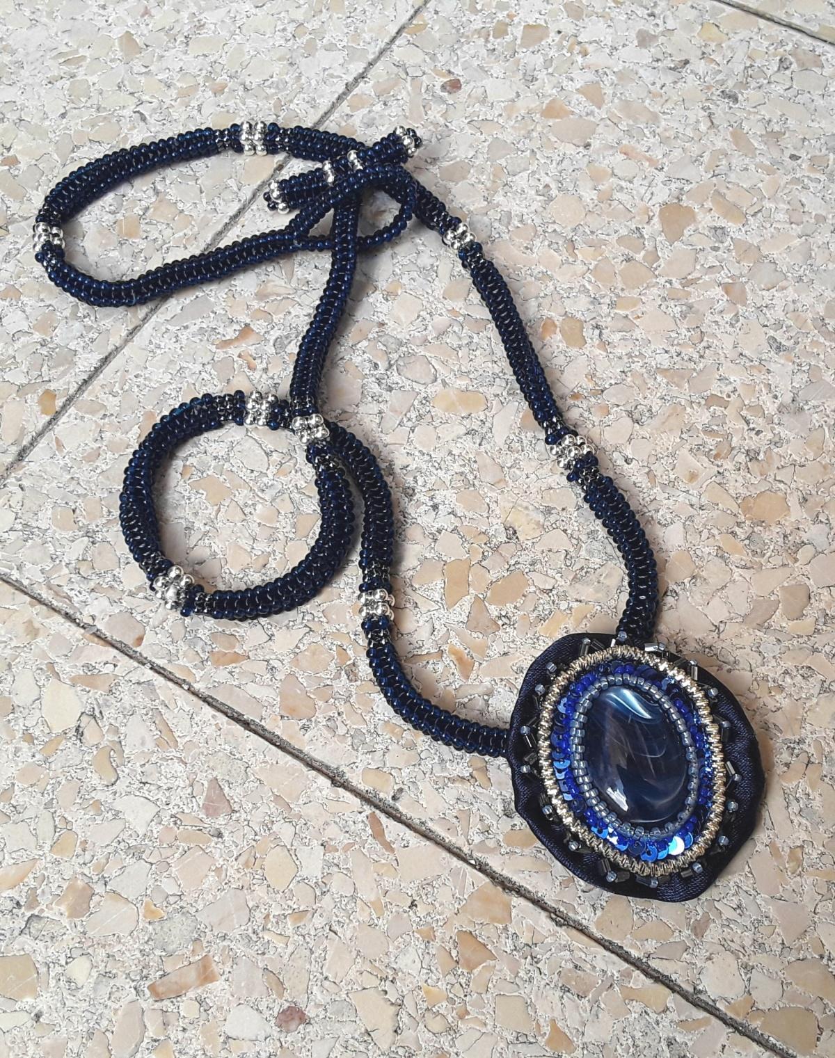 Задали мне задачку: Кулон на бисерной веревочке, синий, очень синий, с синими пайотками и серебра чуток, и чтобы так по молодежному, легко и, немного небрежно, может какую ткань…