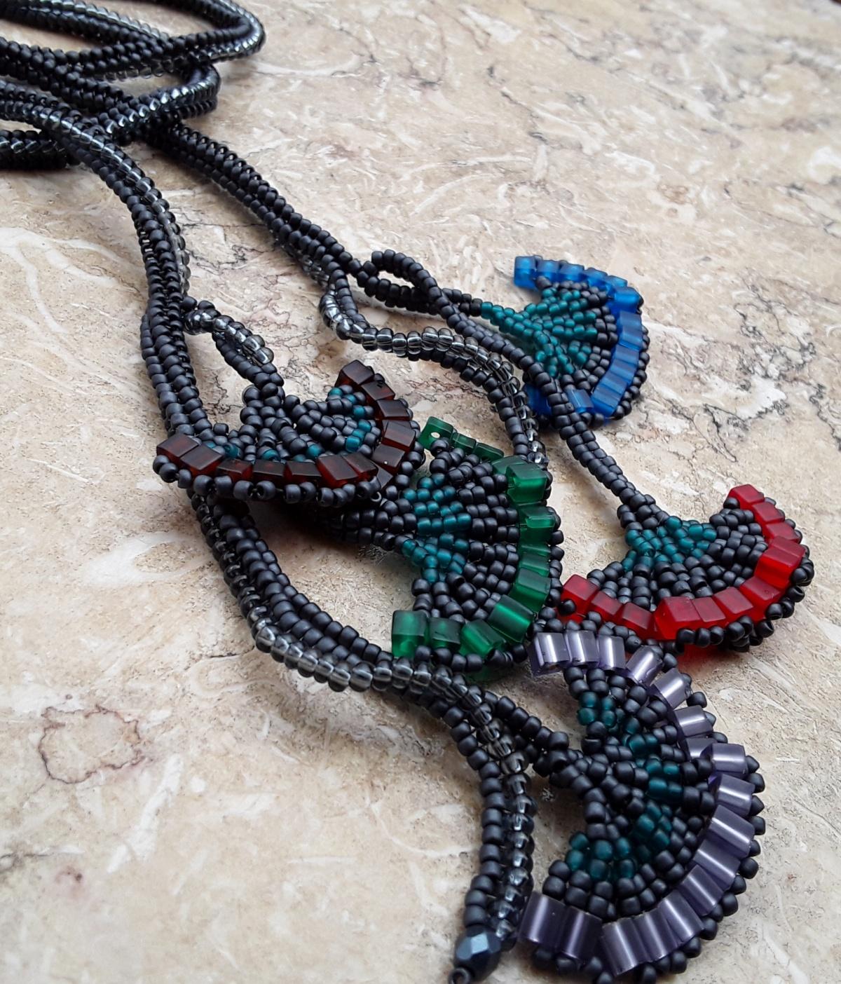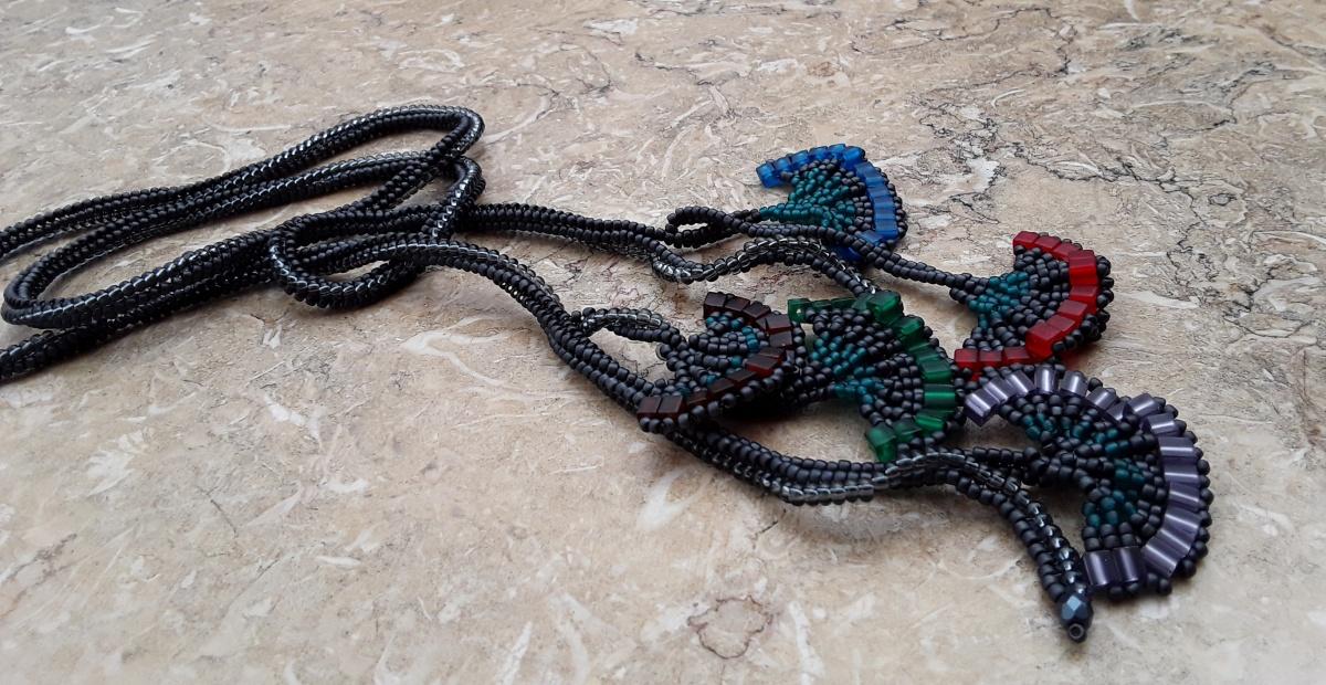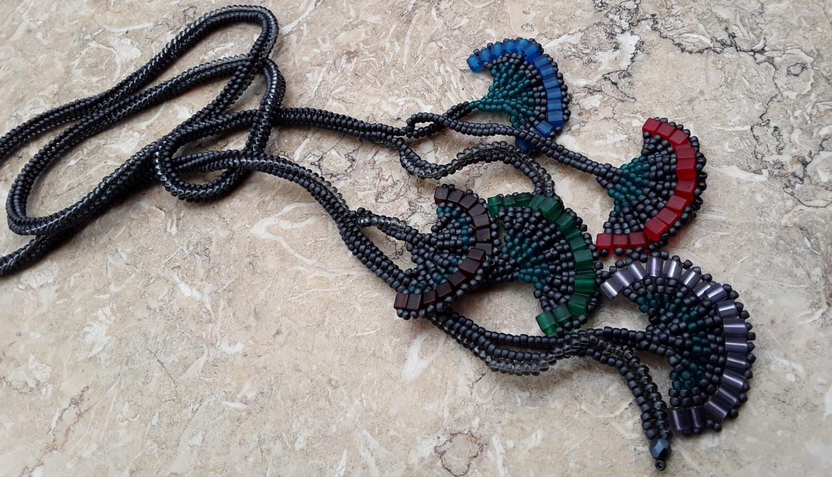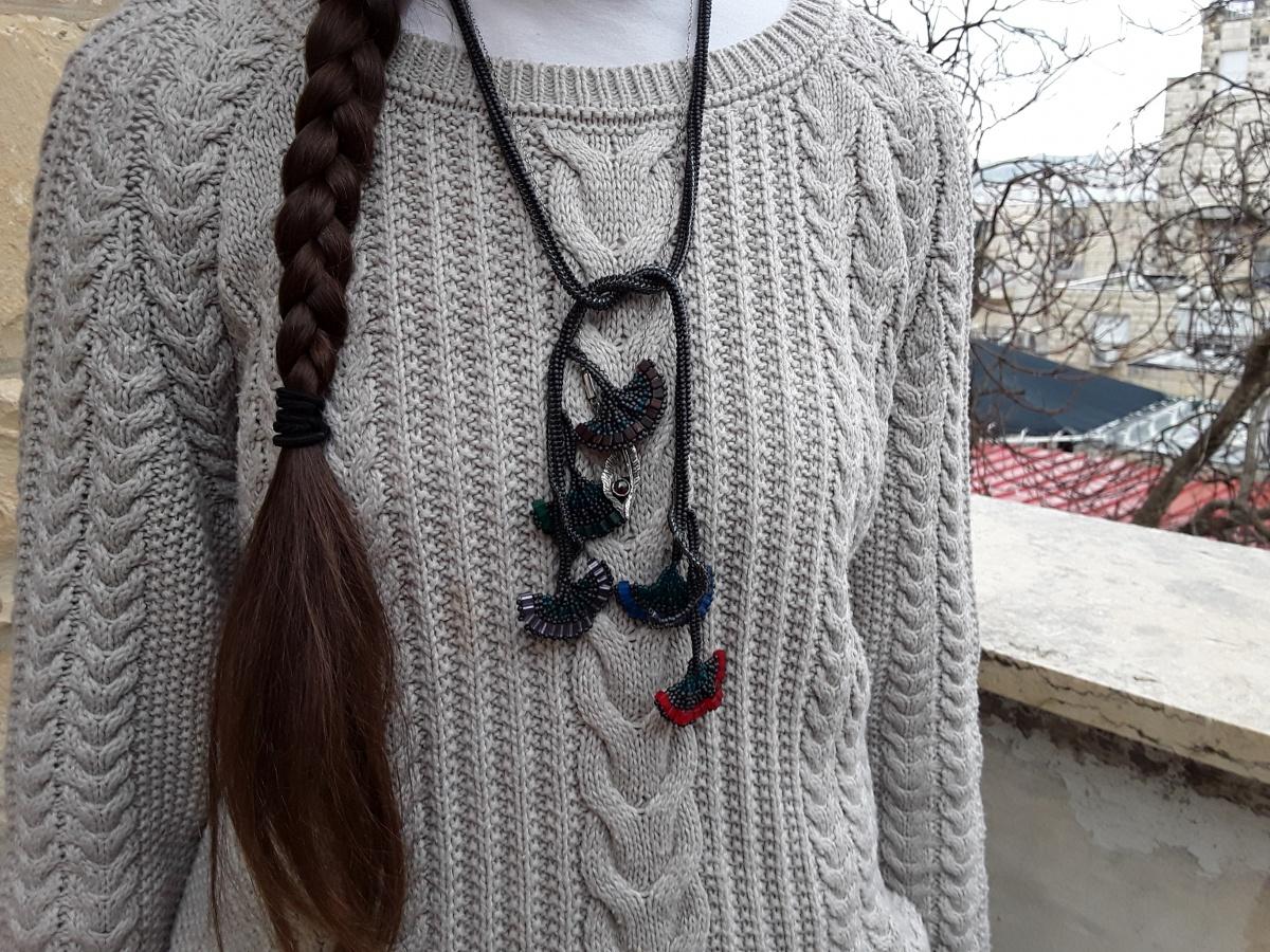 Я уже давно узнаю Ваши работы по фото. Лариат красиво смотрится в темных тонах, ну и листочки с кубиками — находка! Хорошо, что есть доча, у которой есть желания носить мамины изделия!