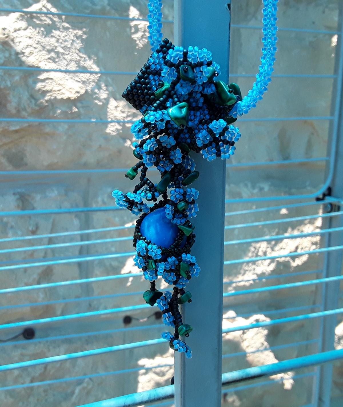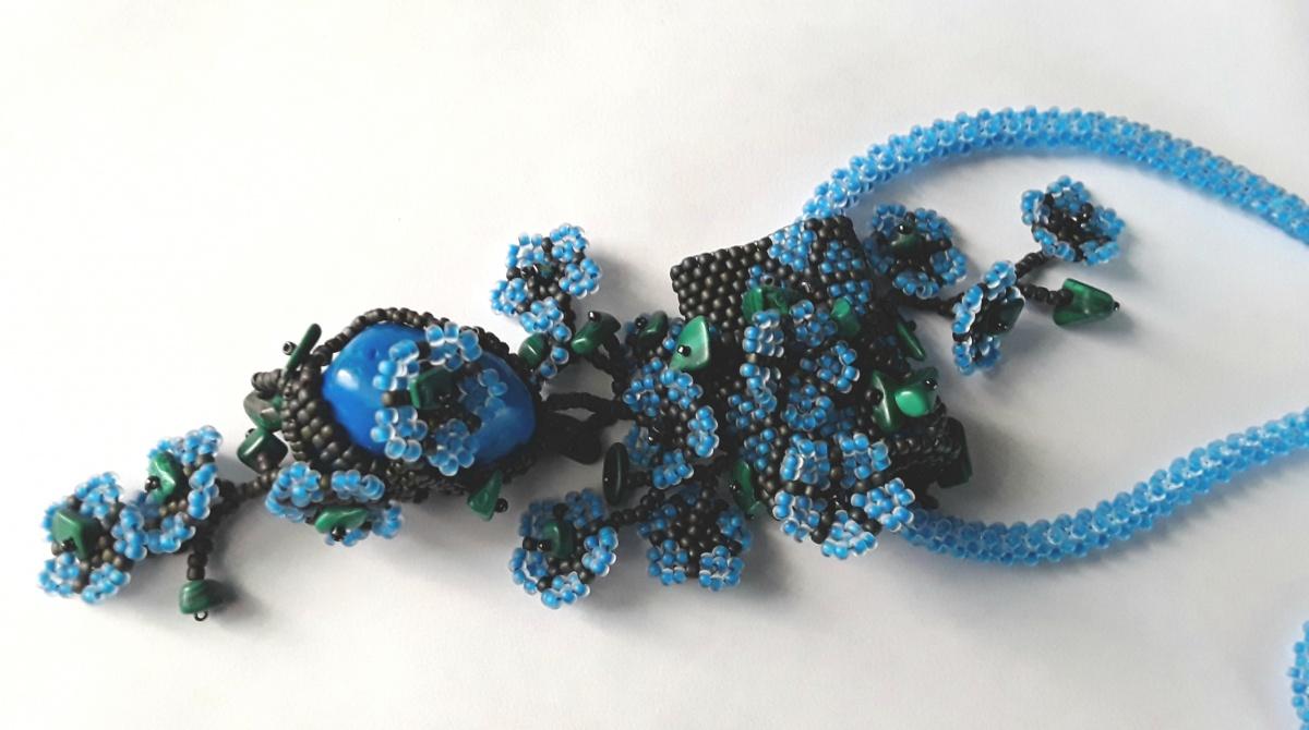 Голубой шнурок, голубые цветочки, камень голубой ( неопознанной породы) и сколы малахита, не голубые… Папа мой очень любил голубой. Вчера семь лет как папы нет с нами… наверное, голубизна украшения этим навеяна. Вдруг захотелось голубого- голубого, яркого и светлого…