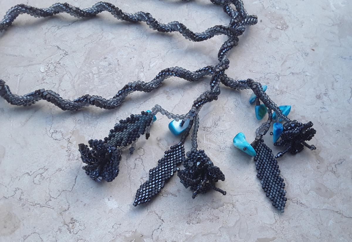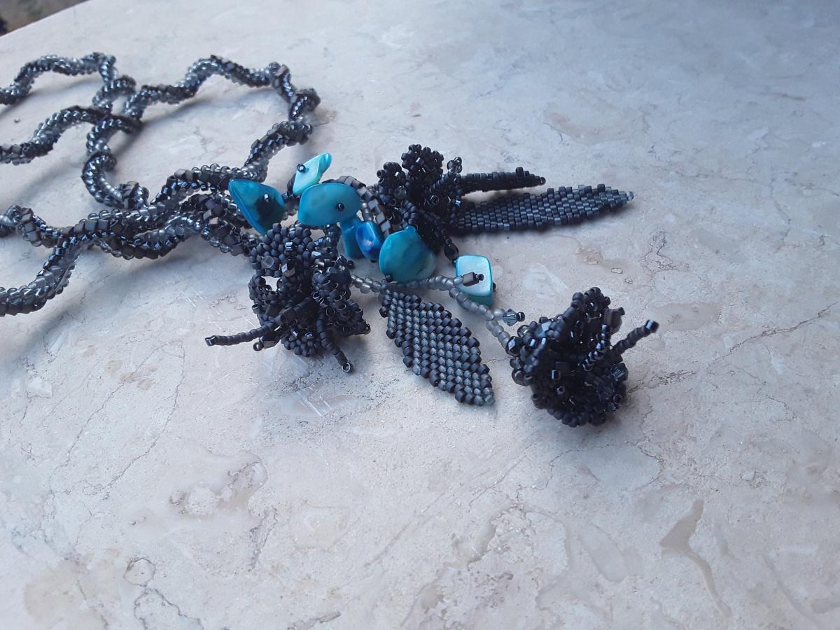Украшение спонтанно настроенческое. Взялась слушать Шопена. Его scherzo меня совсем покорили. Теперь об украшении: ндебеле спираль из треугольников — тохо 8- трежерес 11 — миюки 15. Средней волнистости и винтажности. Цветочки фриформ, тохо 15 и чешские бусины. Ну и бусины прокрашенного перламутра как «шутка» в середине вальса.
