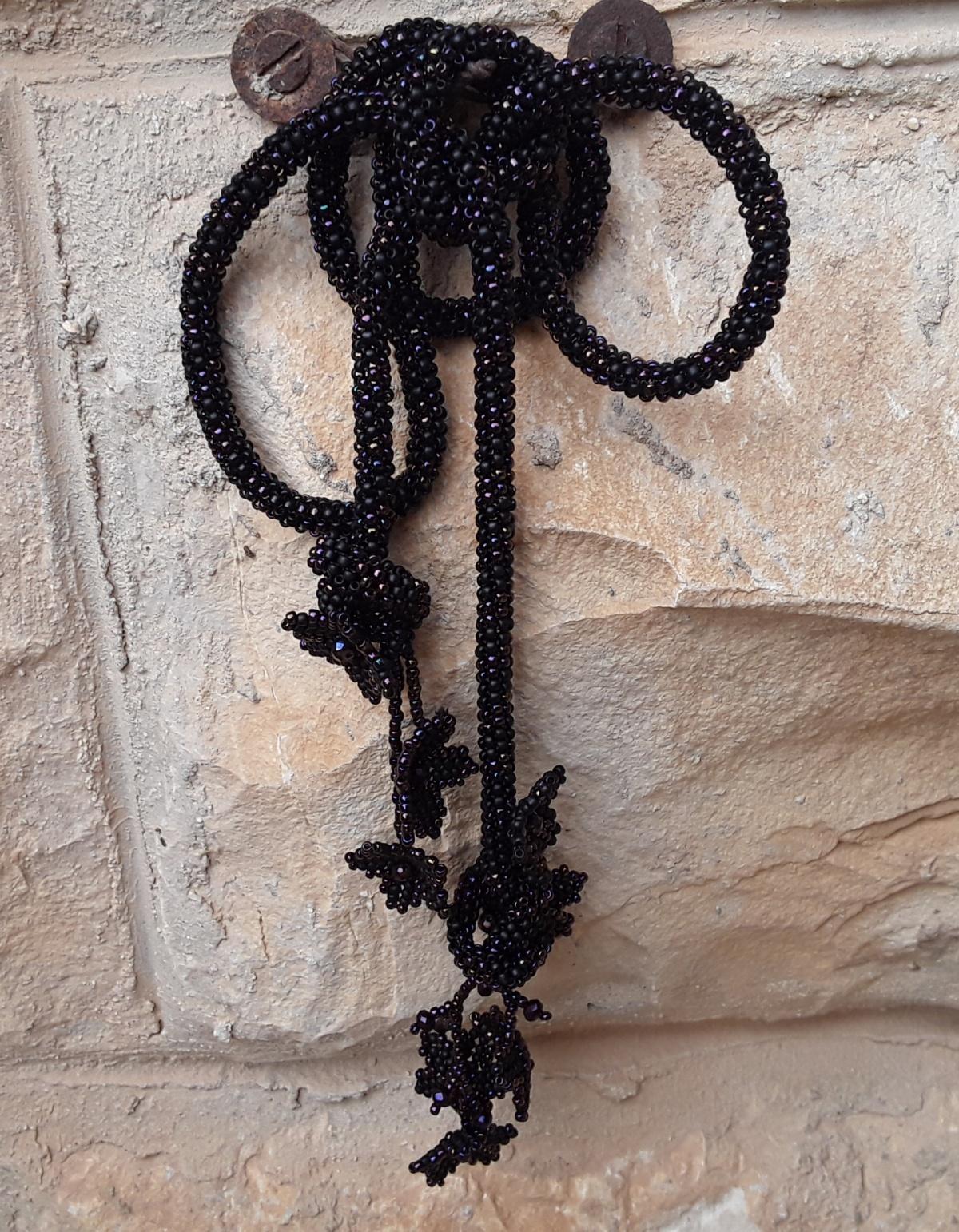 Мозаичная верёвочка на 4 бисерины: 2 чёрных, 2 фиолетовых, 2 чёрных, 2 фиолетовых… Цветочки, куда ж без них. Узелки на память. Ничего особенного, на солнышке блестит…