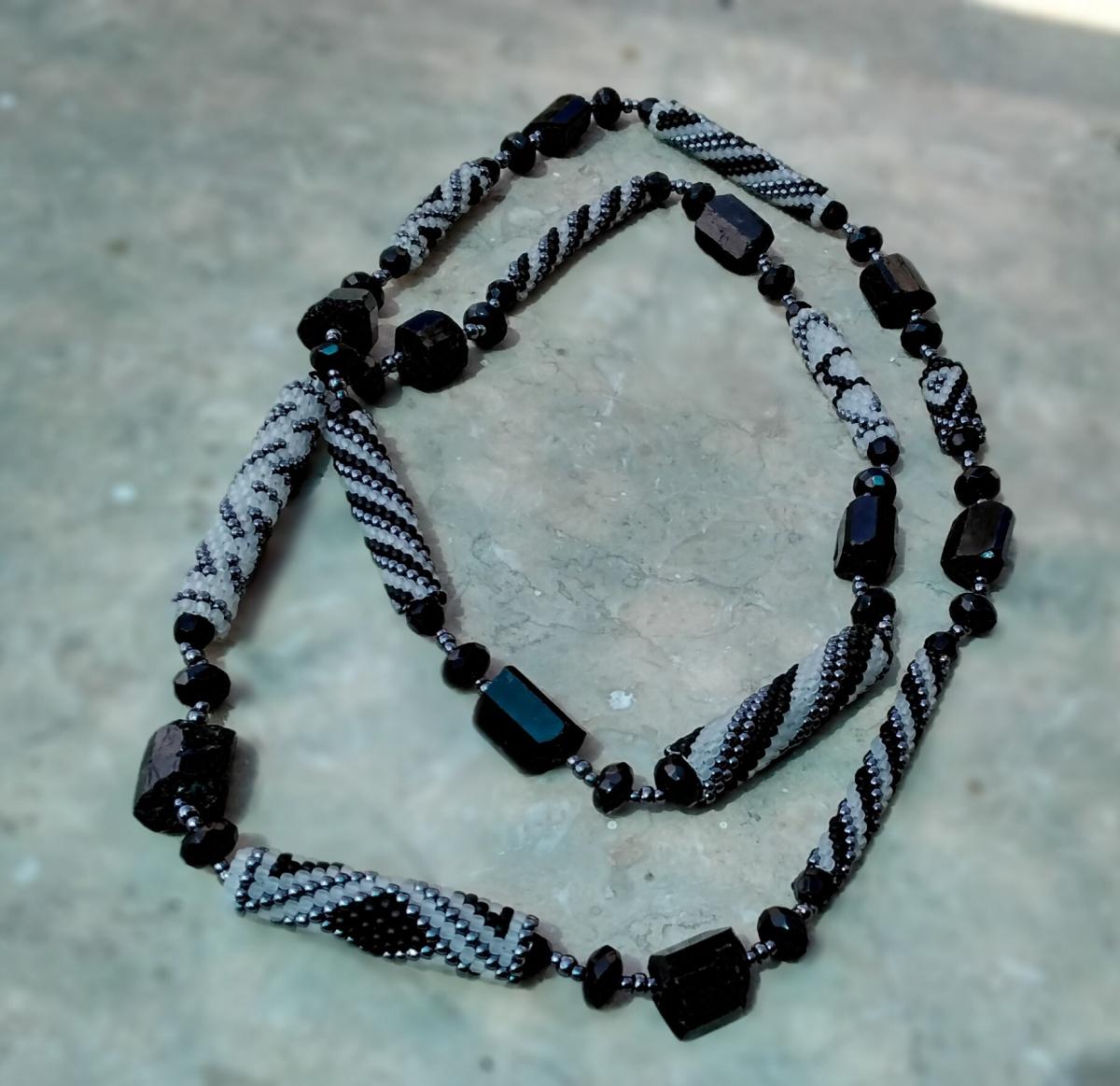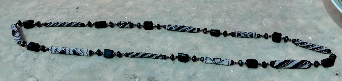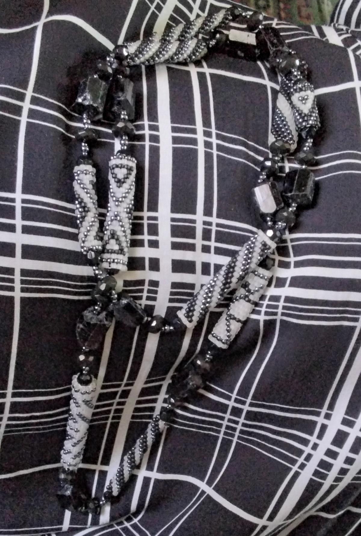 Я оплела две бусины, по размеру близкие к бусинам турмалина, но совсем никак. Сделала две трубочки, одинаковые, примерла к турмалину, лучше. Потом наплела трубочек разного размера и рисунка, мне понравилось больше всего.