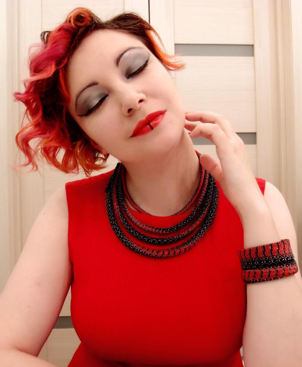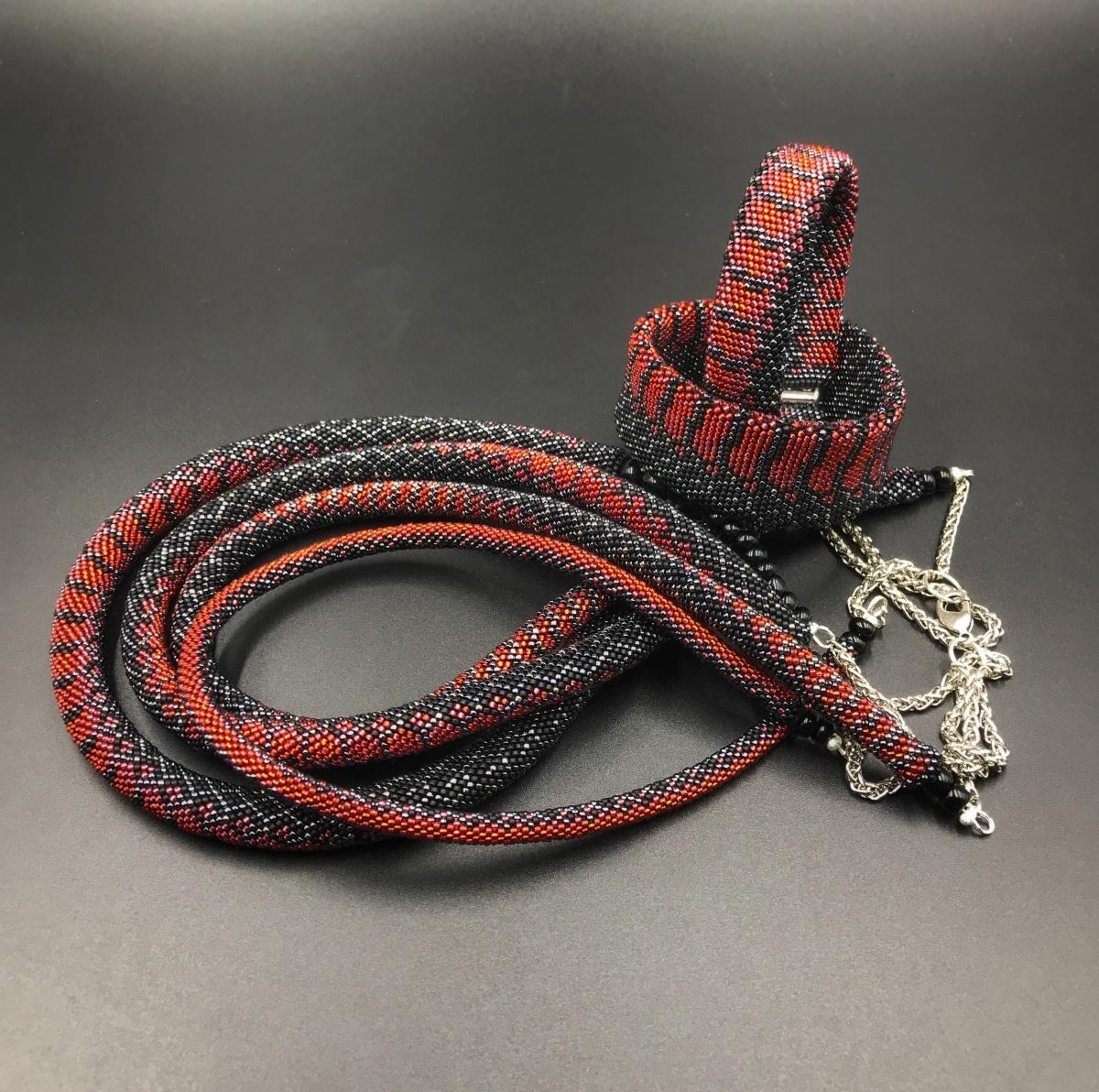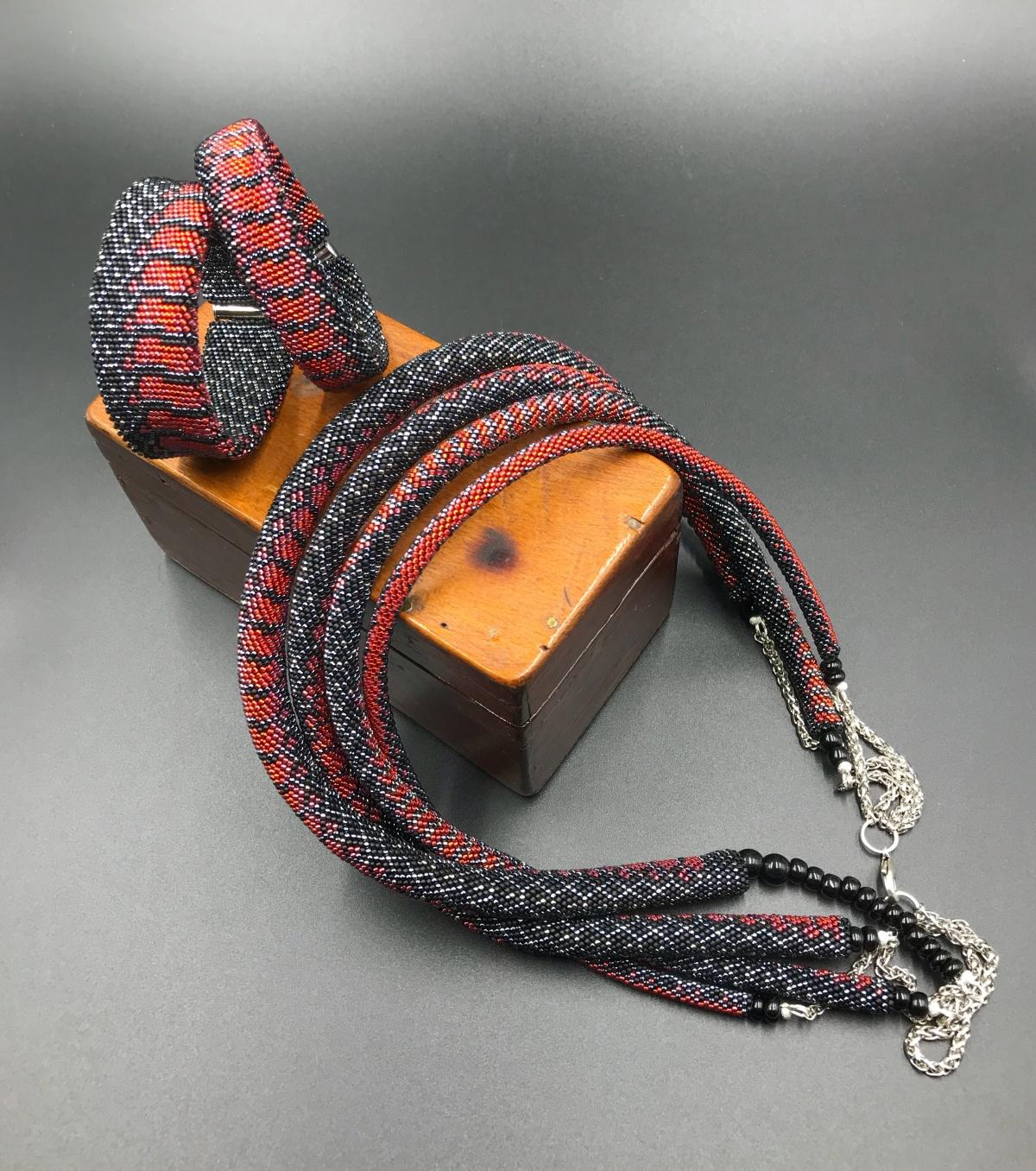 Связано на чёрной ниточке из тохо 15/0 6 цветов не без чёрной магии))) В колье- 4 жгута на 8, 12, 15, 18 в круге, браслеты — на 24 и 36 в круге. Схемы А. Тезиной.Если хочется, браслеты можно сцепить вместе и получить чокер на шею, в чем вы сможете убедиться по фоткам!