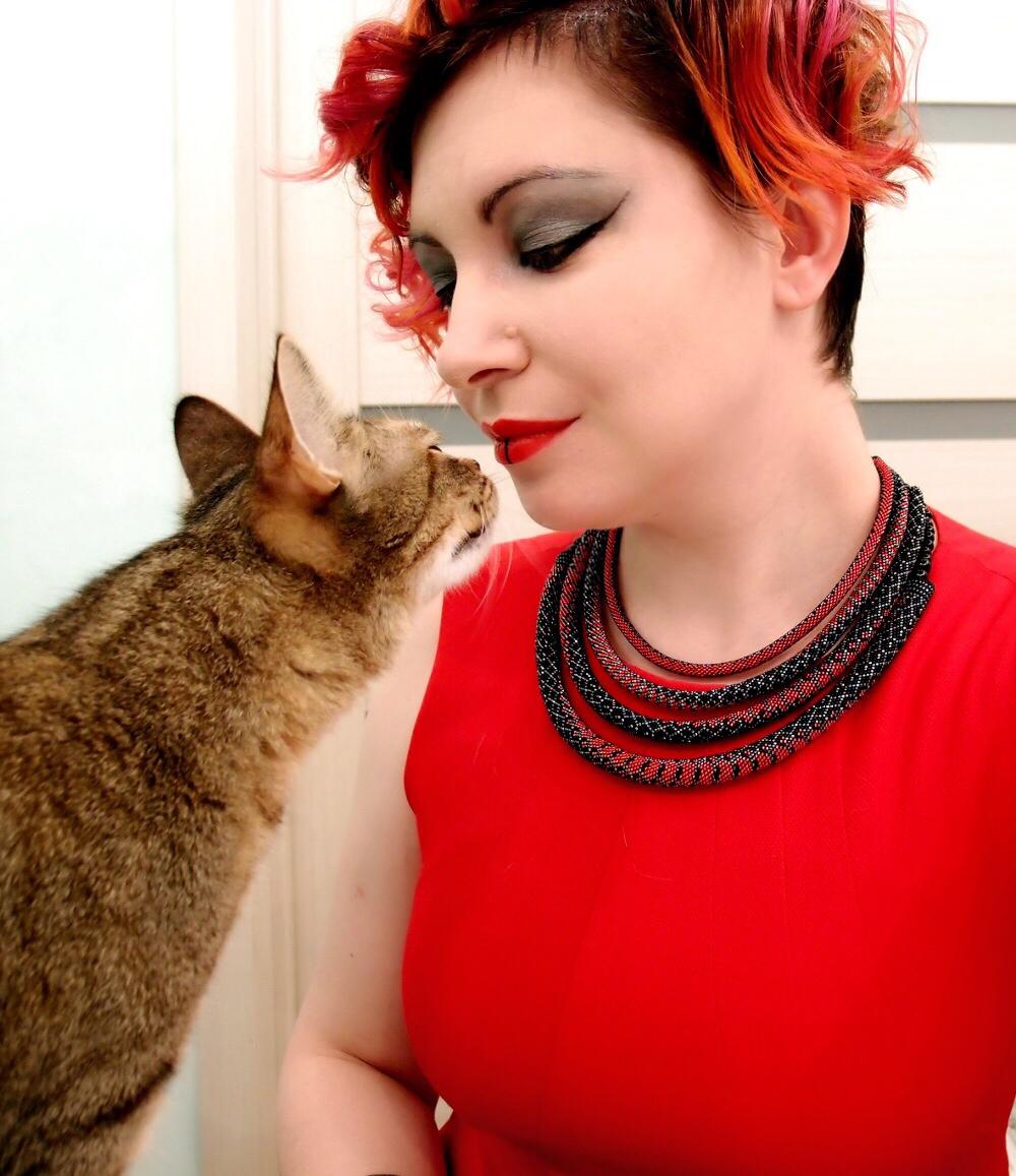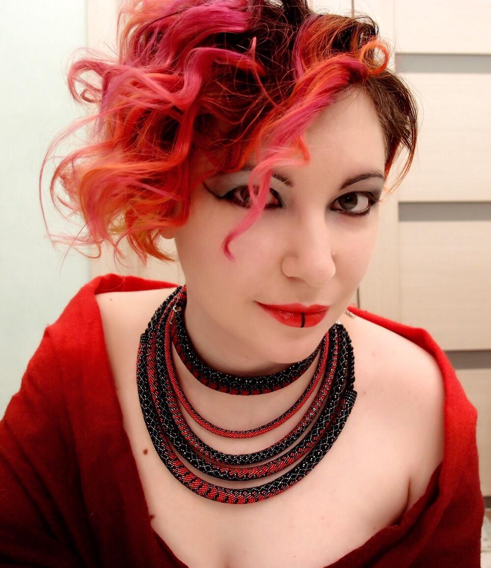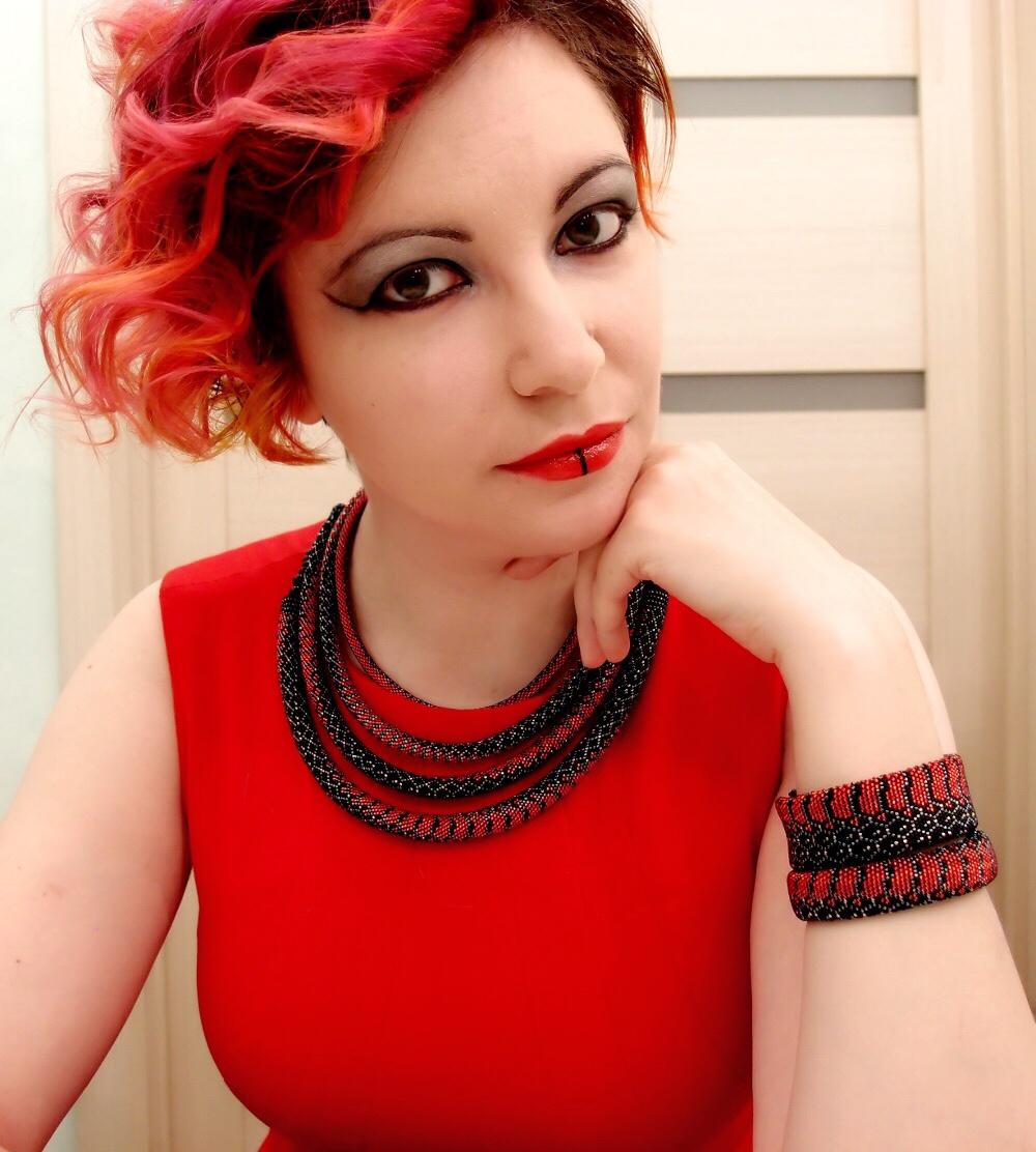 Связано на чёрной ниточке из тохо 15/0 6 цветов не без чёрной магии))) В колье- 4 жгута на 8, 12, 15, 18 в круге, браслеты — на 24 и 36 в круге. Схемы А. Тезиной.Если хочется, браслеты можно сцепить вместе и получить чокер на шею, в чем вы сможете убедиться по фоткам!
