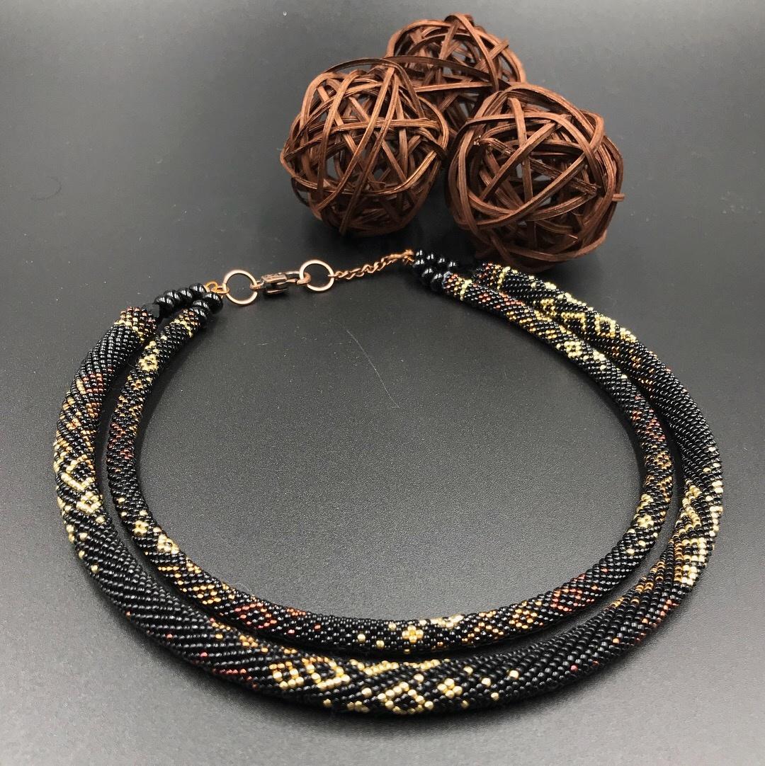 Назрела идея сделать небольшую коллекцию жгутиков по узеньким схемам из 15/0 бисера, с минимумом цветов. Взяла любимый чёрный, золото-бронзу-медь и гибрид. Что получилось — смотрите)))