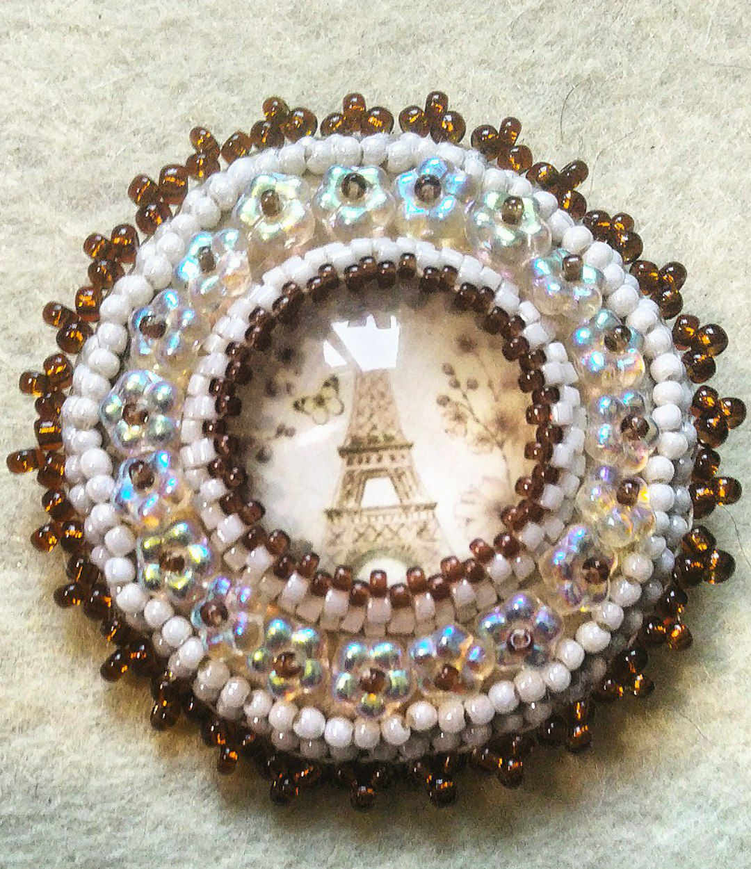 Для изготовления украшения использовался японский цилиндрический бисер номер 11, японский круглый бисер номер 15, чешский круглый бисер номер 10, стеклянные бусины в виде плоских цветов. Кабошон — стекло. Вышита брошь на фетре. Изнанка — натуральная кожа.