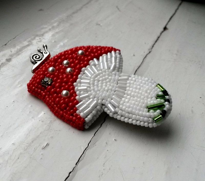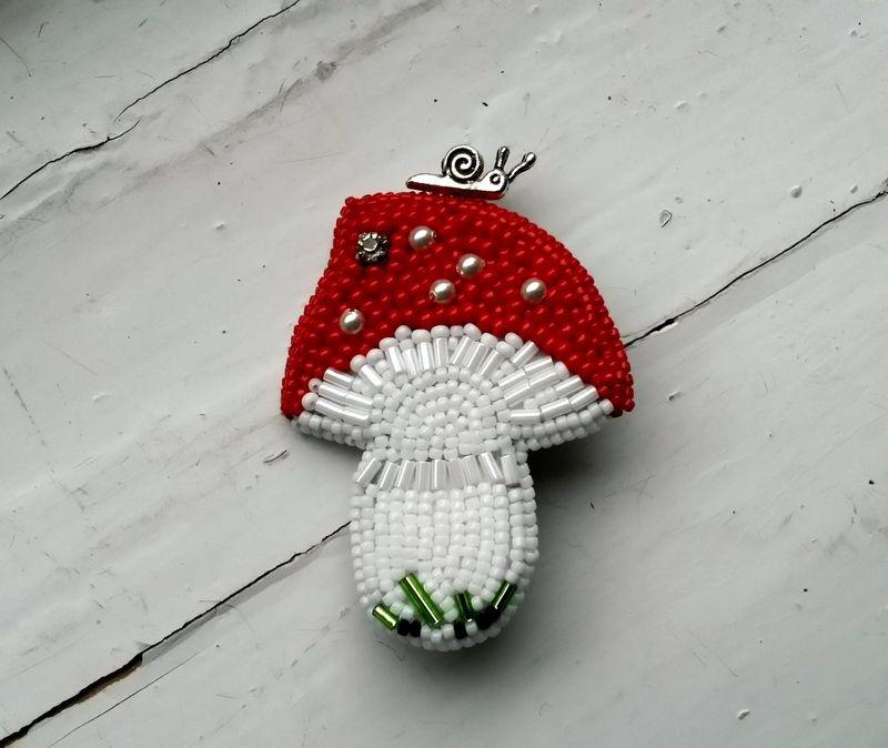 Всем привет! Я тоже не удержалась от мухоморозависимости и вышила брошку, иначе как мухоморЧиком не назовешь, т.к. получилась малепусенькая 4 см в высоту.
