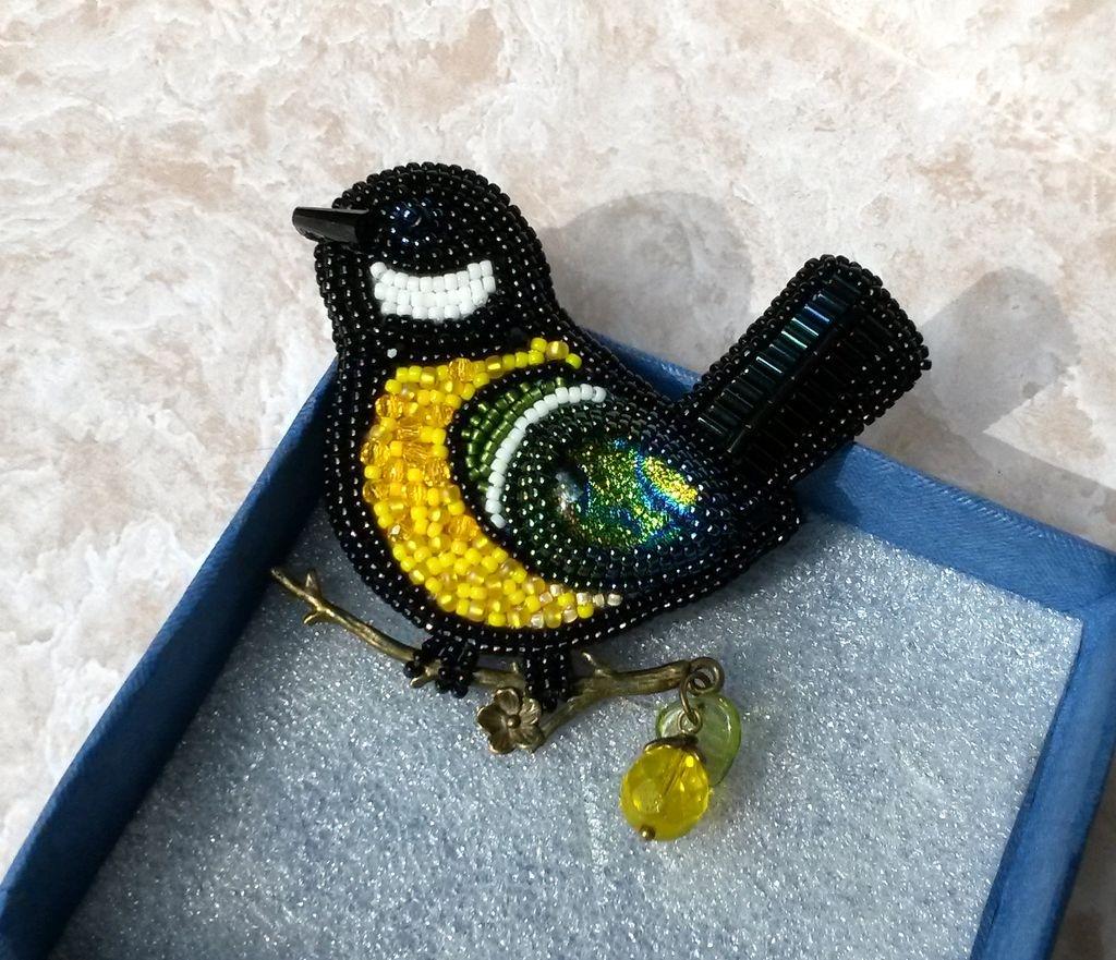 Всем Бусинкам привет! Пришла ко мне дочкина подруга выбирать украшение в подарок маме на день рождения, думала ей жгутик подарить. А меня возьми и дерни за язык, что мама ее прям заправским орнитологом стала, такие красивые фотографии птиц в Инстаграме выкладывает и очень пишет о них душевно. И тут же меня тюкнуло, что ей надо брошку дарить в виде птички и будет очень даже к месту. Подружка идею поддержала, а я получила головную боль в виде срочного заказа. Придумалось мне сделать синицу, пересмотрела кучу ее фотографий, нарисовала, начала вышивать и все время крутился в голове стих С.Я. Маршака «Дом, который построил Джек». Три раза порола, то шов неровный, то цвет не понравился, но в итоге я ее победила. Брошь подарена, вроде даже понравилась (я с одариваемой знакома, но она на все лето в деревню с внучкой уехала) и вот смотрите результат.