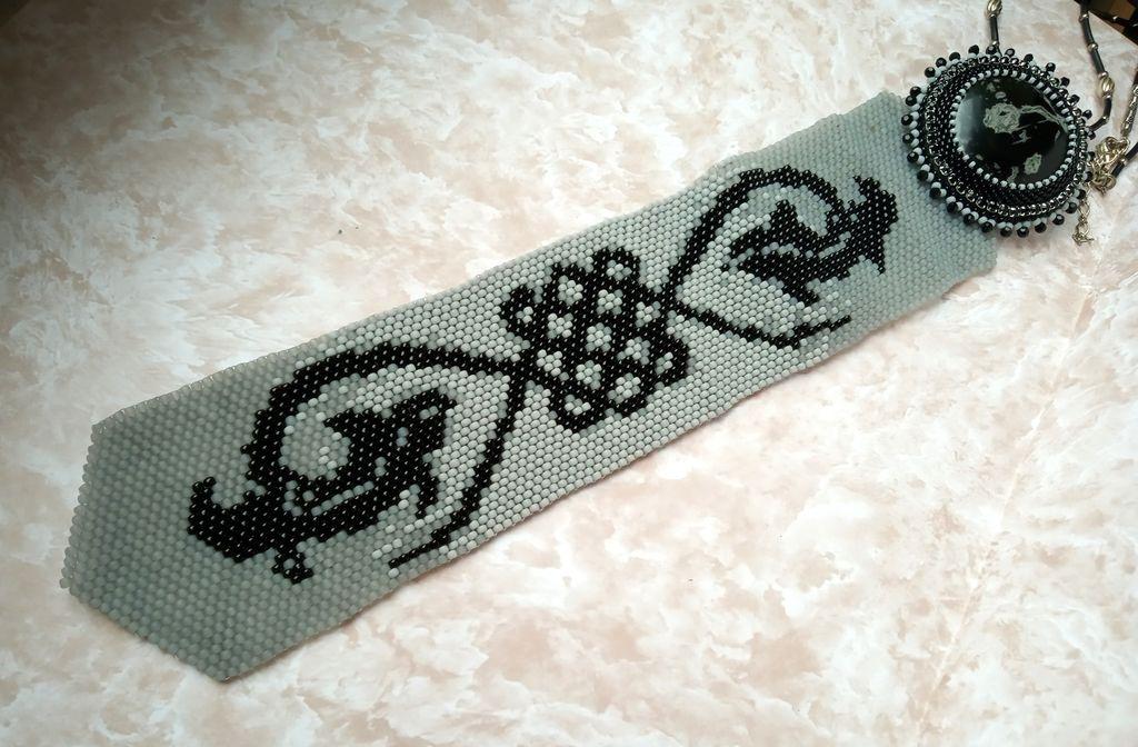 Всем Бусинкам большой привет! Наконец я его сделала. После чудесных галстуков Оли (НовОля) я наконец решилась сплести, хотя с плетением не дружу. Схему нашла на просторах интернета, бисер тохо 11-й, кабошон — роговик. Попробовала сделать трансформер, можно носить как брошь, кулон и галстук. Заказала черный кристалл-подвеску, чтобы цеплять к кулону, но пока не получила. Работой не довольна, при переходе цвета видно, что бисер немного отличается размером и полотно ведет, но распускать пока жаль. С названием не определилась, может вы подскажете.