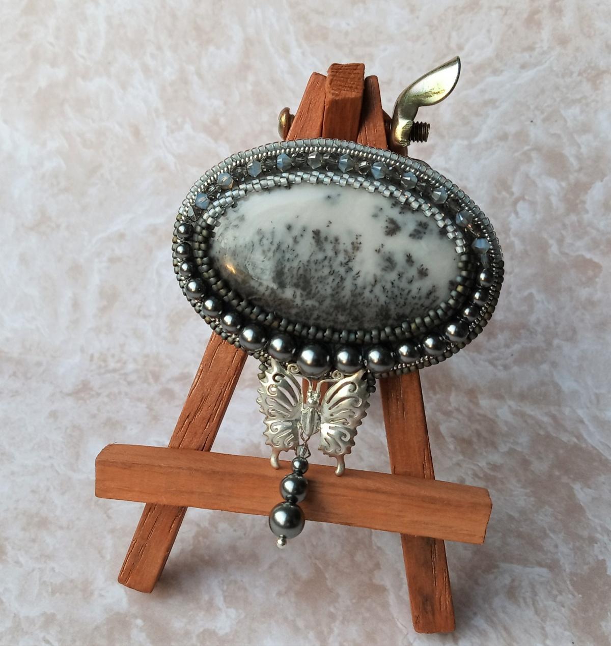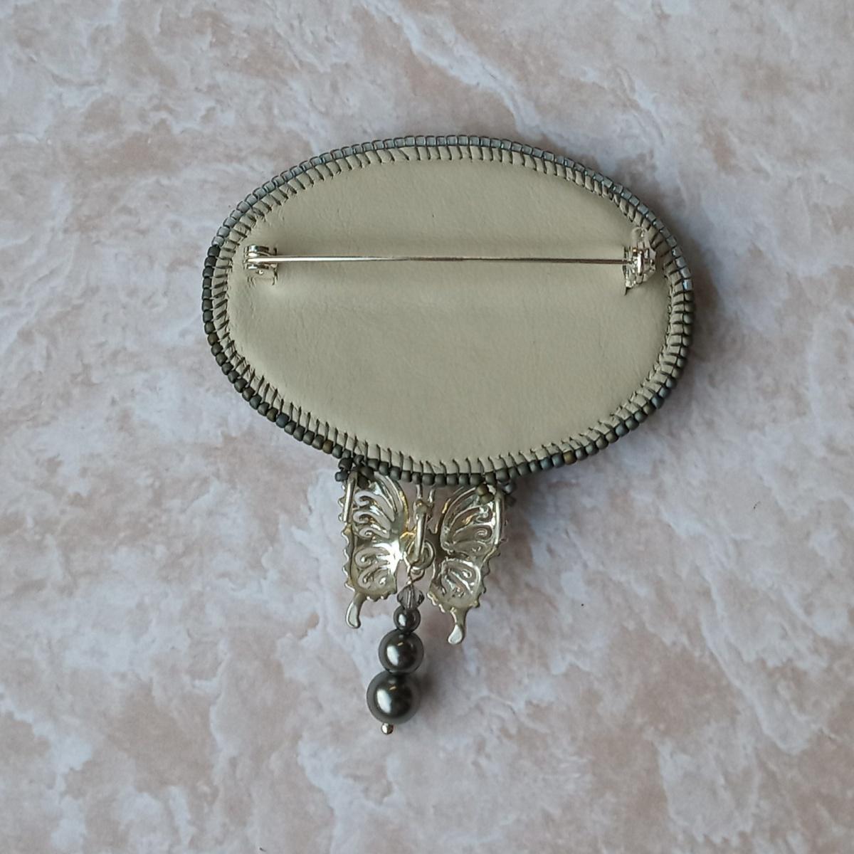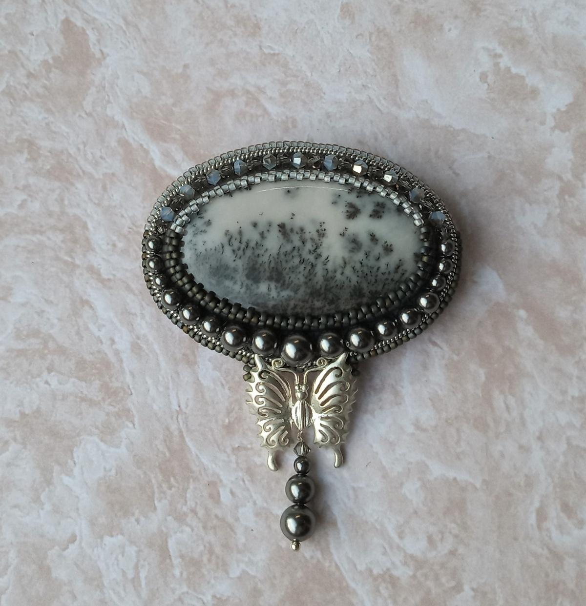 Всем Бусинкам привет! Забыла показать эту брошь, а все потому, что не могу определиться с названием. Вроде вся такая серенькая, как пейзаж за окном поздней осенью с первым снегом, а с другой стороны бабочку прилепила, или это летний луг в монохроме? Подскажите кто что видит, плиз.