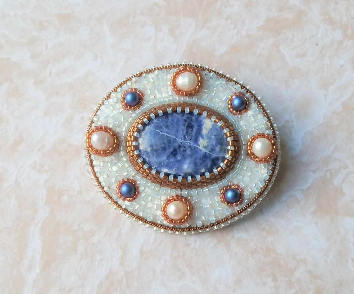Всем Бусинкам привет! Насмотрелась я в интернете картинок и видео с экскурсиями по музеям Москвы и С-Петербурга и вышила эту брошь. В центре содалит, вышивка японской деликой и пятнашкой, натуральные и австрийские жемчужины.
