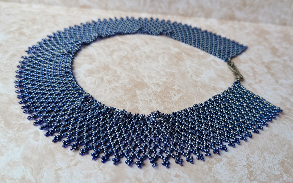 Всем Бусинкам привет! Для кружевного флешмоба сделала небольшую брошь с кружевной лентой. Думала, что сделать ее будет совсем просто, но оказалось нет. С кружевом провозилась два дня, не получалось красиво уложить складочки вокруг камня, но в итоге сделала, хотя не совсем то, что представлялось. Камень ларвикит, я его очень люблю, у него встречается красивая иризация сине-голубого цвета. Ну и подсела на сетчатые воротнички и сплела из 11-го гематитового чеха еще одну сеточку.