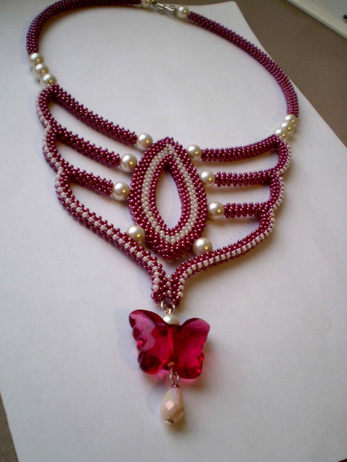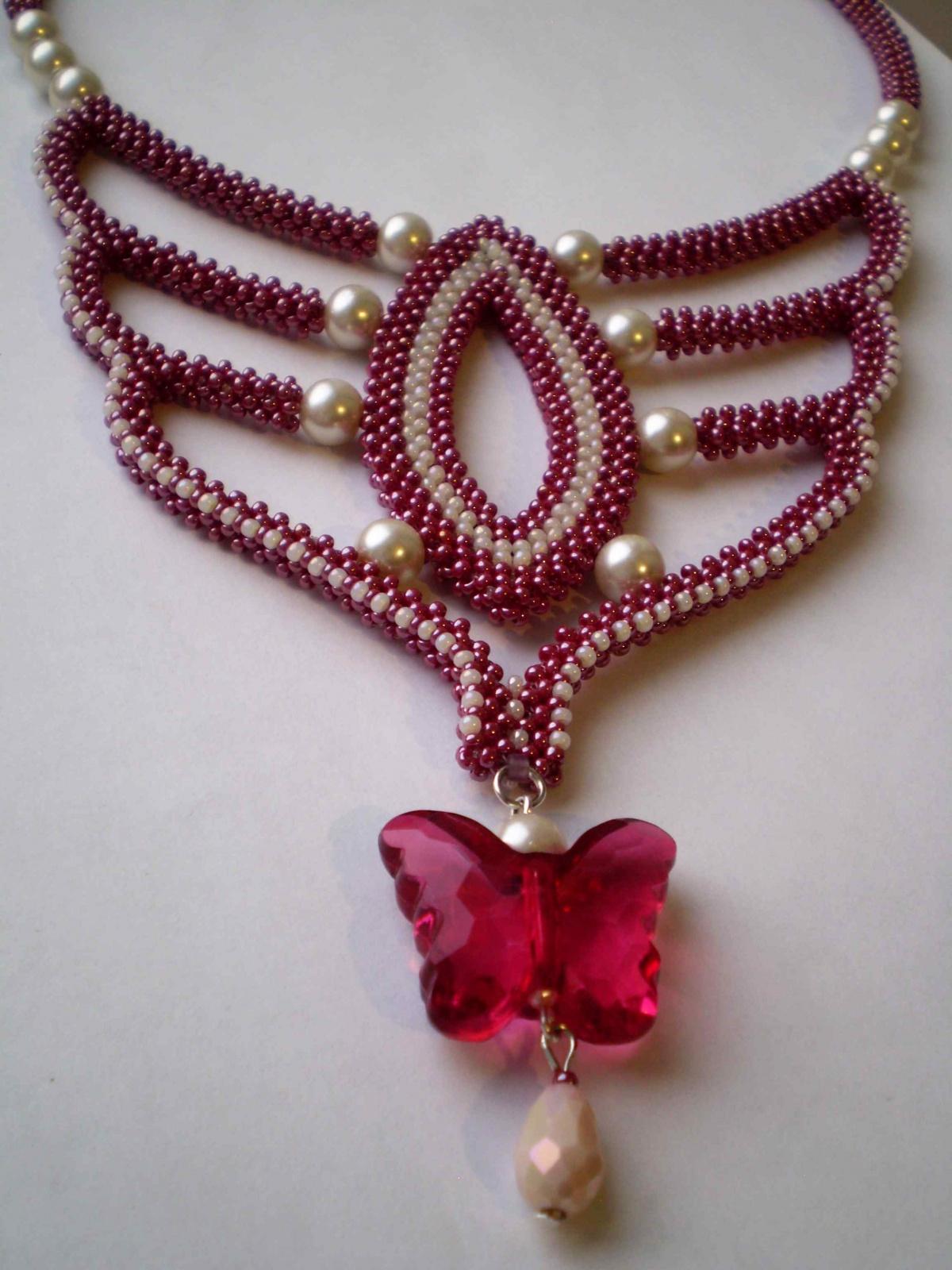 Этот эскиз ждал своей очереди практически год, т.к. был нарисован в феврале. И снова для центрального элемента была совершенно другая задумка. В нем должен был быть вставлен кристалл формы «маркиз», и снизу подвешена капелька. Но кристалл так брыкался и упирался, что после пяти или шести (я уже не помню) раз попыток его оплести и вставить в центральный элемент, ничего не получилось. Хотя в самый последний раз (моего терпения) я его все-таки оплела и вшила, то на утро нашла его на столе с двумя лопнувшими бисеринами отделочного ряда!