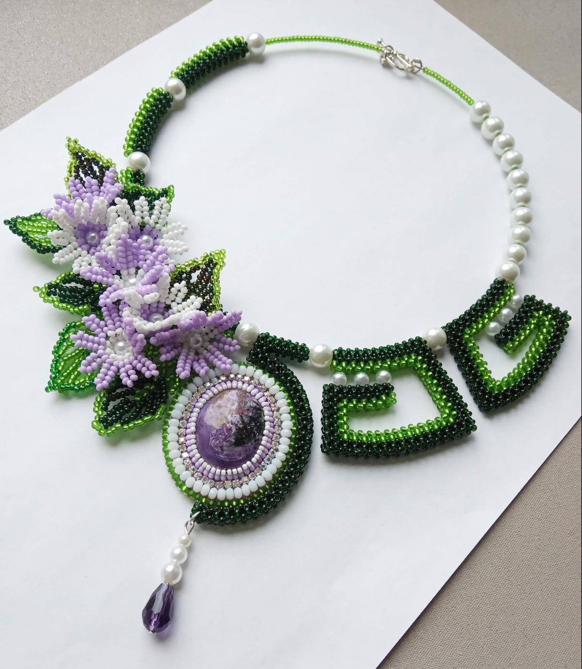 Эскиз нарисован был наполовину, т.е. его геометрическая часть. Но делать его симметричным совсем не хотелось, а других идей не было. Да и с цветом было не все понятно. И как всегда в подобных случаях на помощь пришел «Господин Случай». Разбирая свою коробочку с пробными элементами, случайно оказались рядом два совершенно разных по цвету (белый и сиреневый) и форме цветочка с кучкой зеленых листиков «разных мастей», которые вдруг и определили цветовую гамму всей работы и дополнили недостающую половину эскиза, которую дорисовала уже по готовому колье.