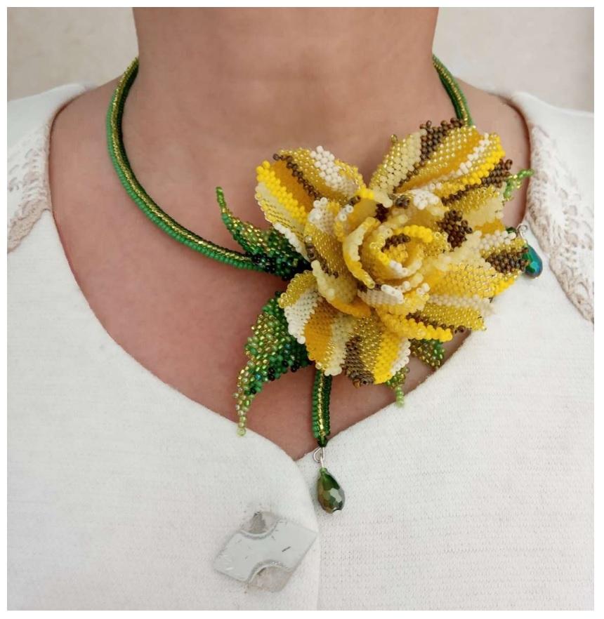 Ощущение дежавю поддерживает желтый цветок, которых было уже два — Плетистая роза и Королева сада. Но желтый цвет солнца притягивает и предлагает различные варианты сочетания цветов и формы. В этот раз меня хватило на цветок мозаикой. Листочки традиционно кирпичиком, а квадратный жгут решила заменить ндебеле. Выглядит изящней, что мне и нужно было…