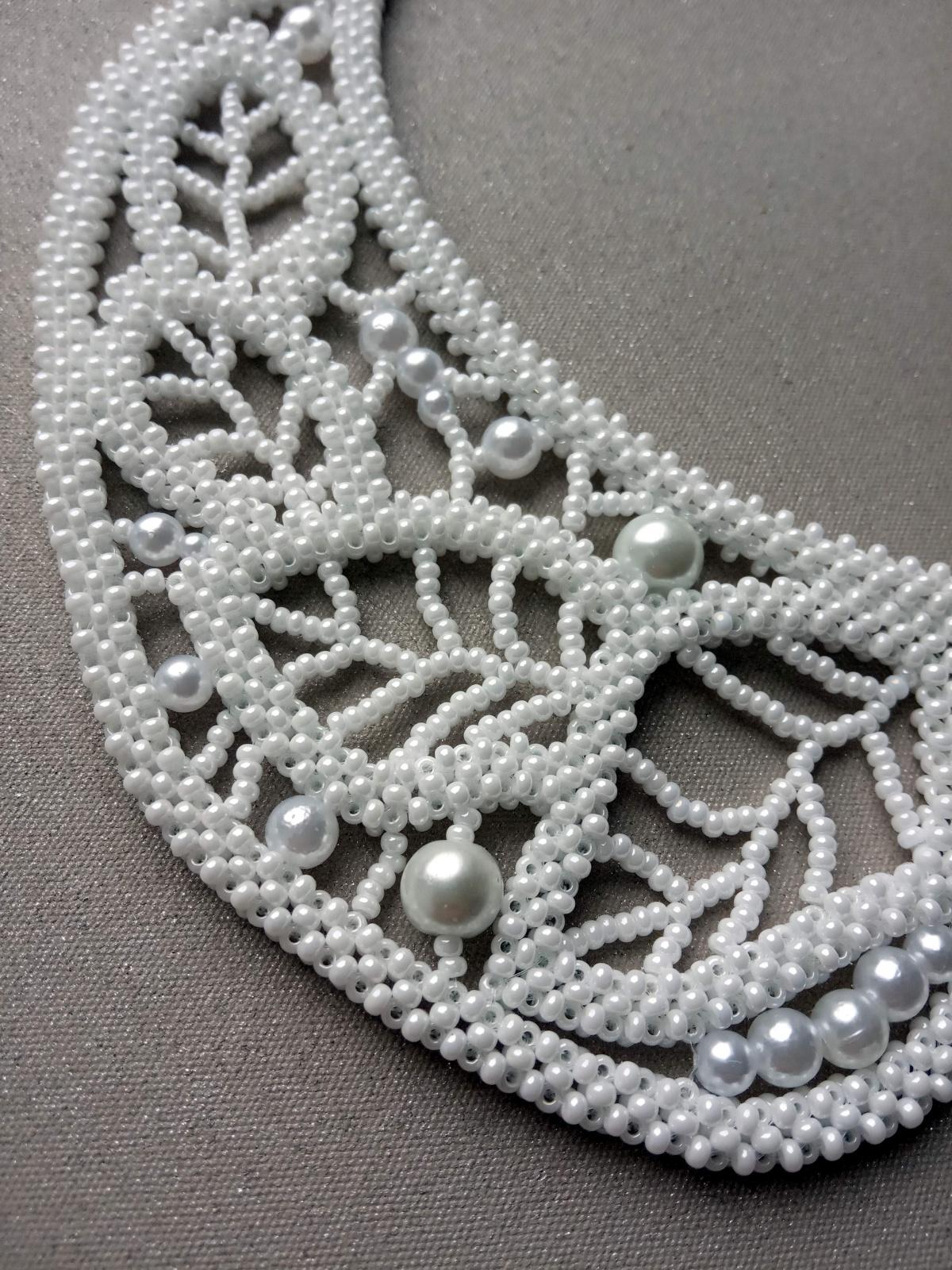 Марина! Огромное спасибо! Заказчица попалась неуверенная, когда я ей показала воротник Ришелье, то ей он понравился, а когда спросила, все ли оставляем «как есть», сказала, что капля не нужна. Хорошо, я не стала спорить. А когда во время плетения одела на мемори две части воротника без бусины, то они соединились довольно плотно и пришлось бусину все-таки вернуть на место.