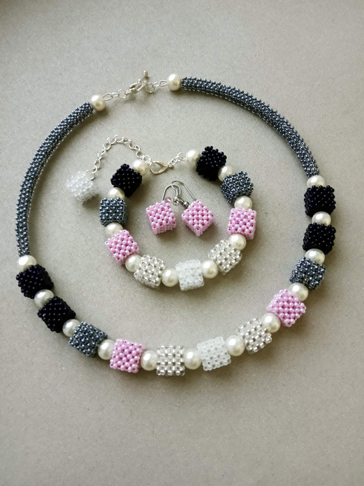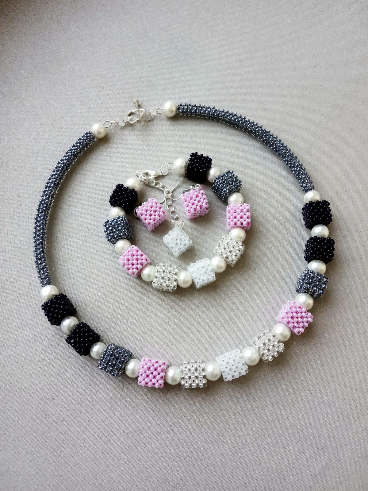 Я, после Вашего предыдущего, делала в бирюзовом с белым: так и не поносила — купила сразу постоянная ценительница, как показала. Только пришлось на длинный мягкий квадратный шнур перевешивать… Ну, я ей практически все украшения подгоняю по фигуре.