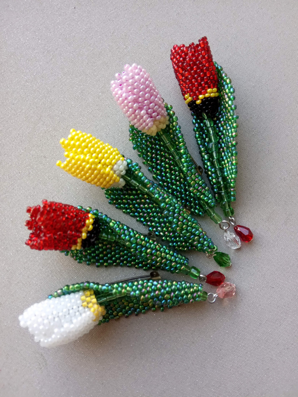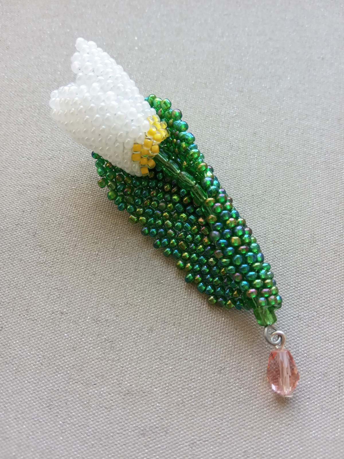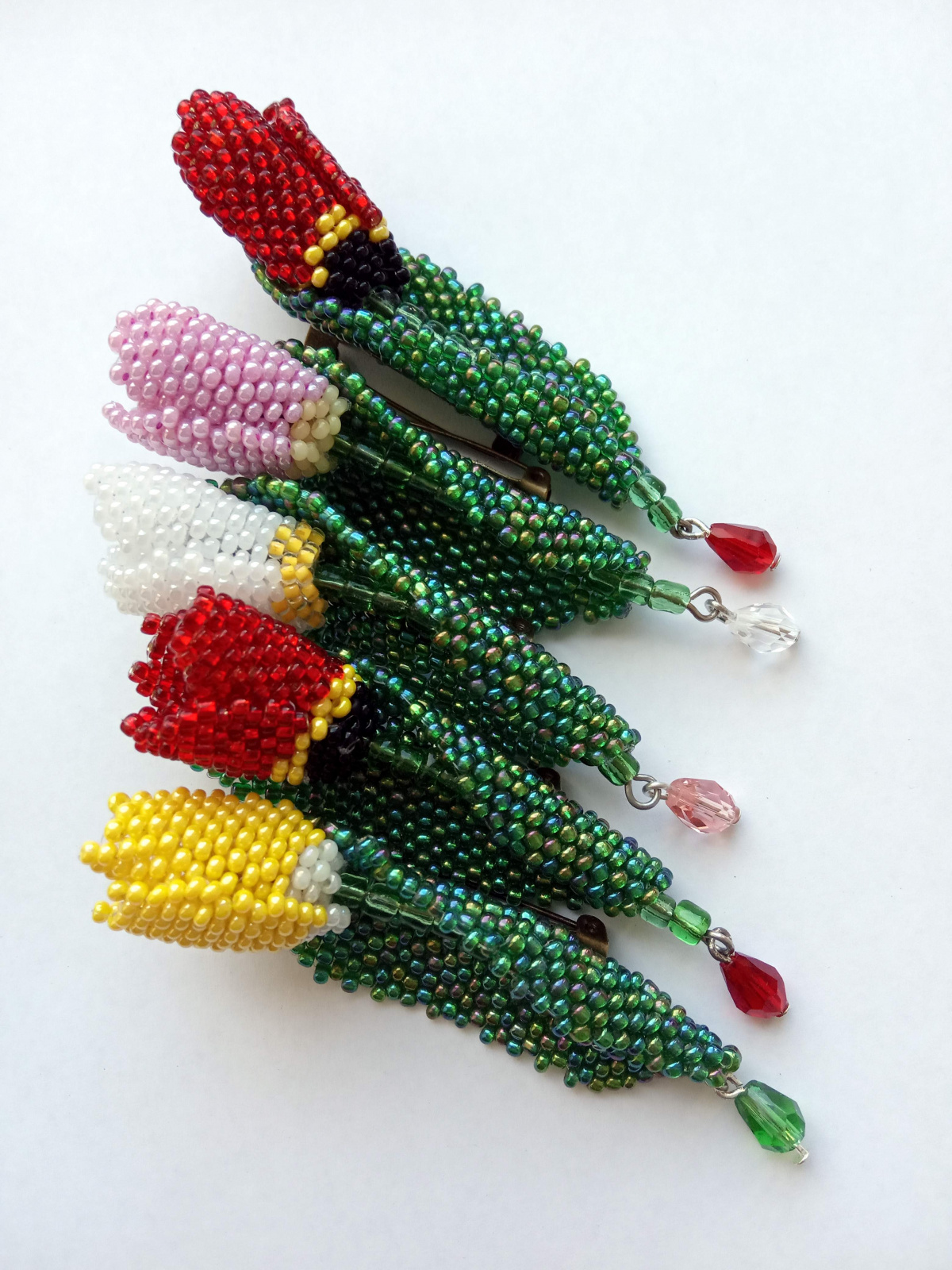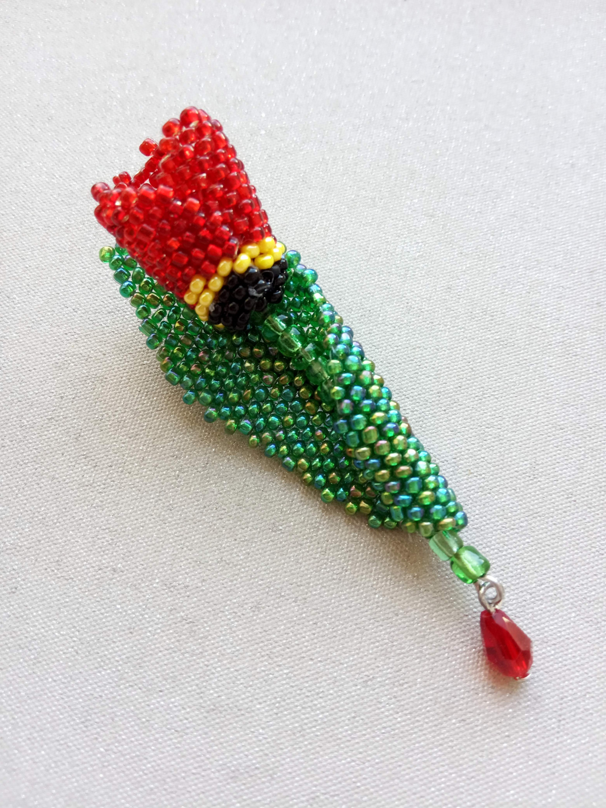 Так здесь все очень просто — плетем три цветных лепестка и один большой зеленый лист. Цветные сшиваем между собой, формируя цветок и вставляем в него проволоку с зелеными бусинами или крупным бисером (стебель ). На большой лист с изнанки пришиваем застежку, а с лицевой стороны цветок. По желанию можно подвесить капельку. Все — брошь готова.
