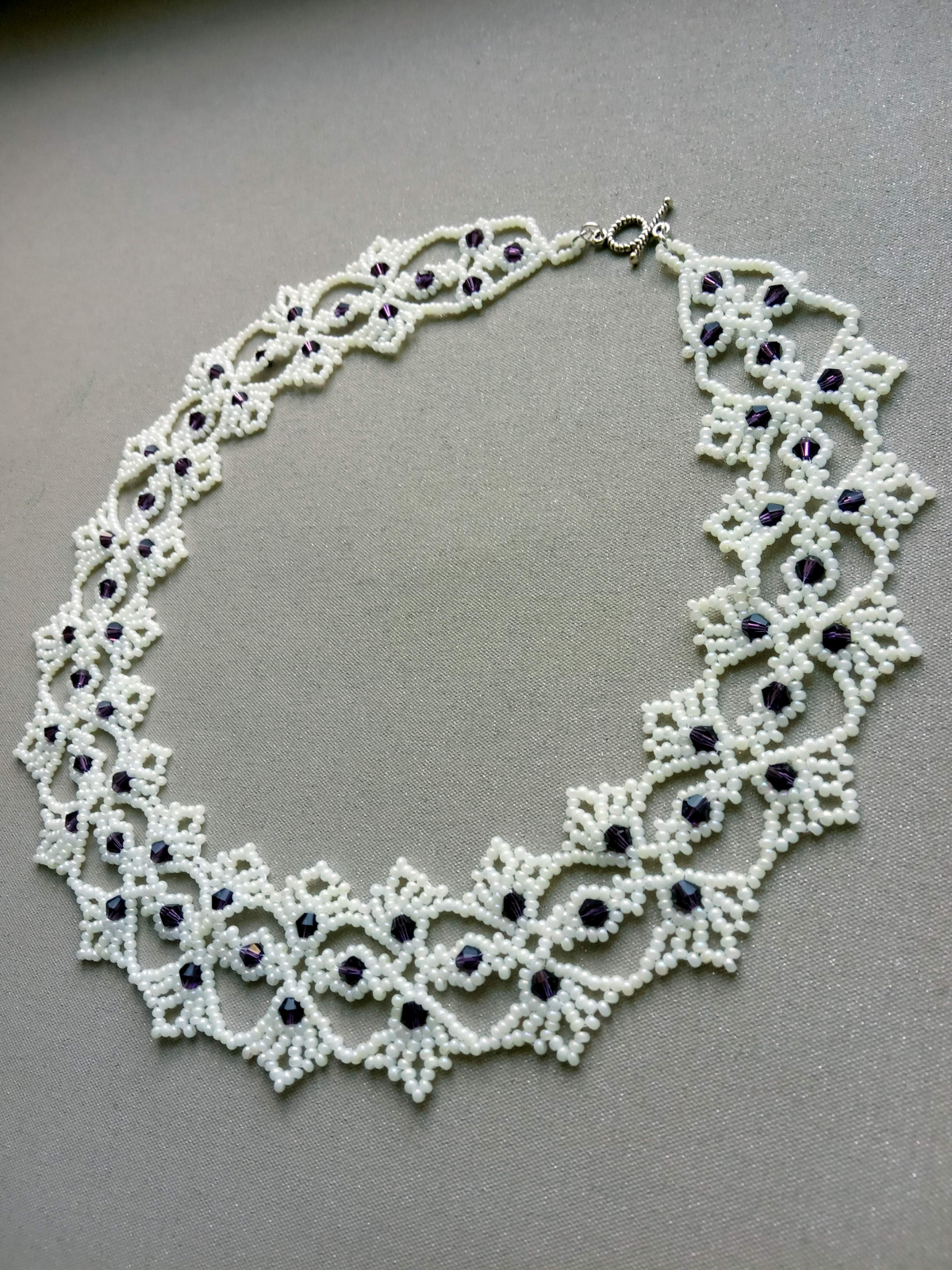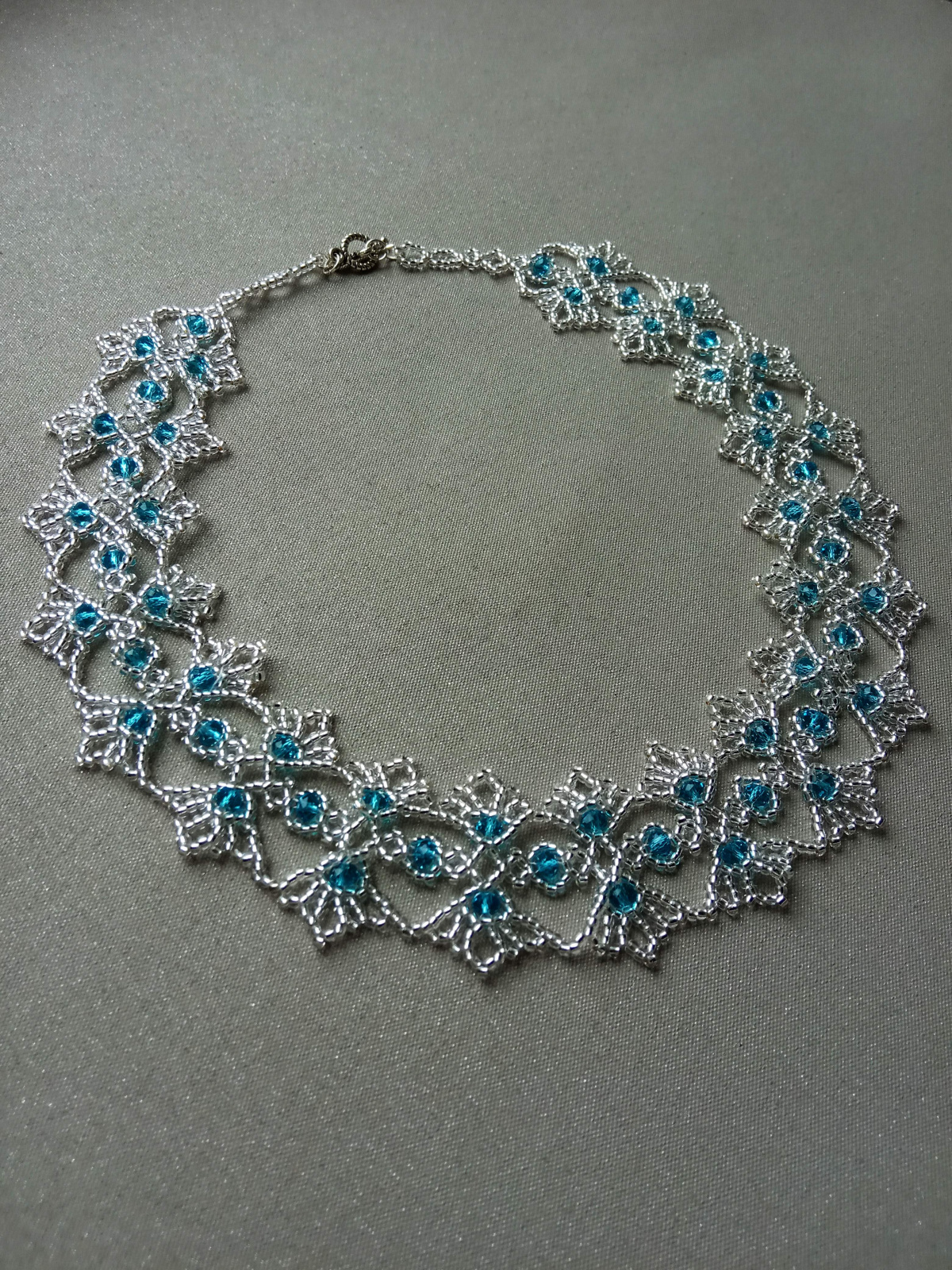 Следующие плела уже с учетом того, что при первом наборе центральная часть должна быть длинее готового изделия, т.к. приплетая крайние кружавчики, колье уменьшается…