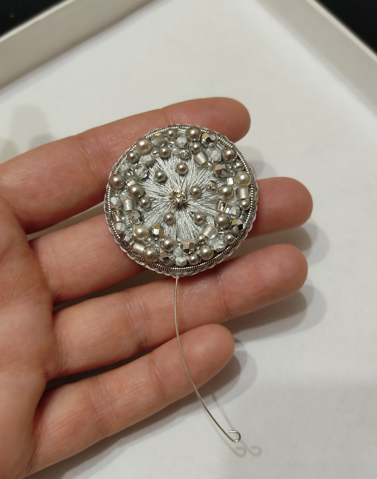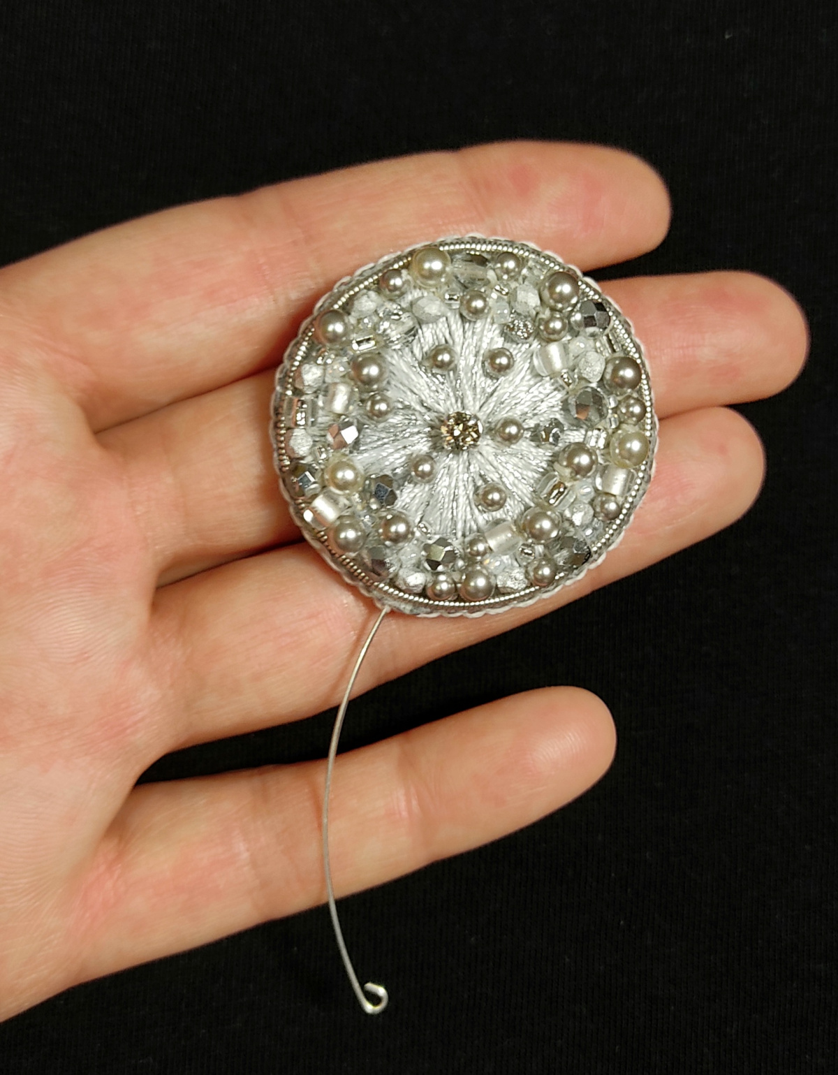 Сделала вот такую брошь. Цвет серебристый, не очень получилось передать его -все блестит.
