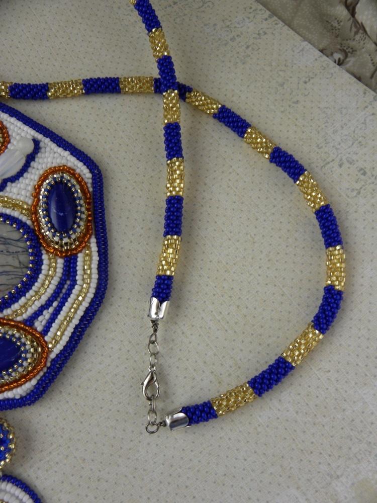 Кабошоны азурита и лазурита, риволи Сваровски, стеклянные и каменные бусины, чешский и японский бисер. Изнанка — натуральная кожа.