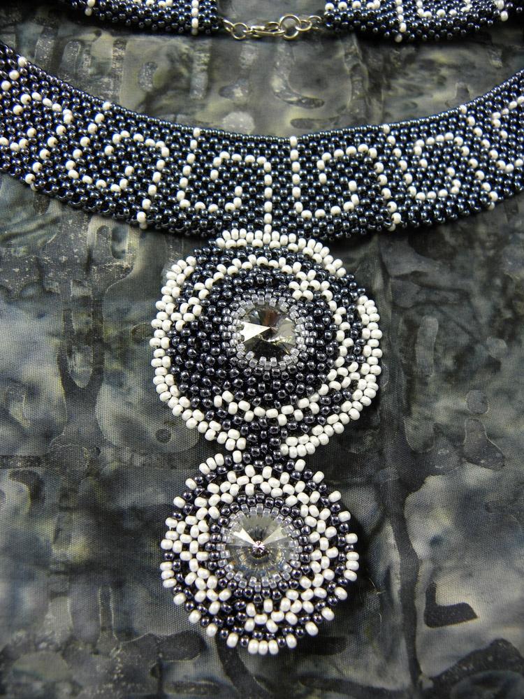 Вопрос: за счет чего у колье изогнутая форма — оно ведь не прямым пояском смотрится. Количество бисерин на первый взгляд в верхнем и нижнем рядах одинаковое, расширения кажется нет. Предположу, что за счет размера бисера.