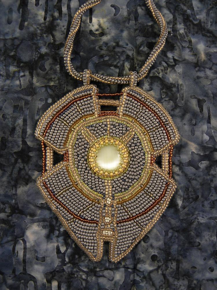 Стеклянный кабошон с эффектом «кошачьего глаза», японский бисер 11 и 15 размеров, немного проволоки в перемычках, фетр и натуральная кожа.