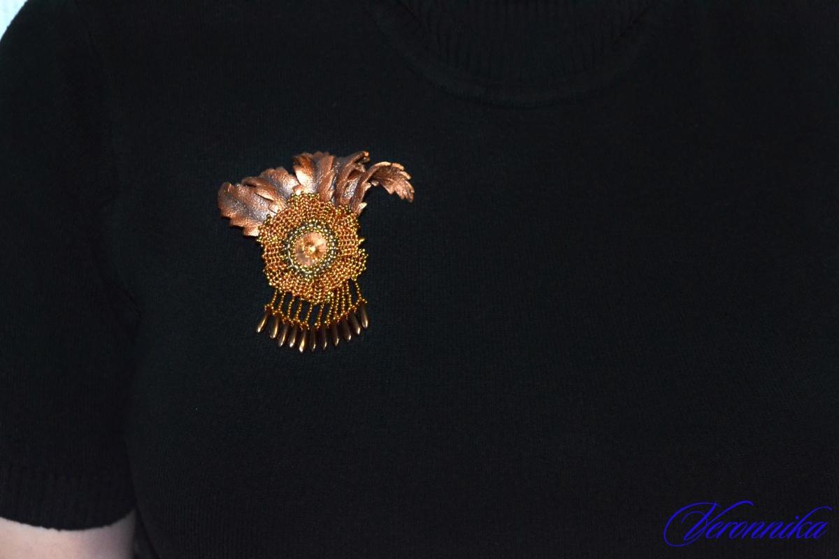 Но тут в личке поднялся вопрос на тему формовки кожаных элементов. Что бы освежить в памяти сей процесс, сделала несколько листочков. Цвет случайно подошел к цветочку. Ну и создалось такое маленькое нелепие )))) С кожей я на «ты», а вот художественных талантов у меня совсем нет )))) Но брошка классная получилась. Уже выгуляла ее.