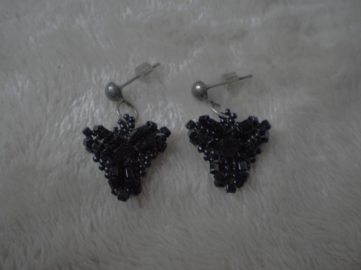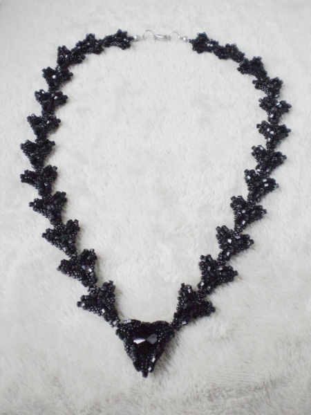 Старенький комплект из расшитых треугольников. Использовалось три вида бисера ТОХО и кристаллы Сваровски. Риволи в центре колье круглая, кстати, просто так оплетена, что выглядит треугольной.