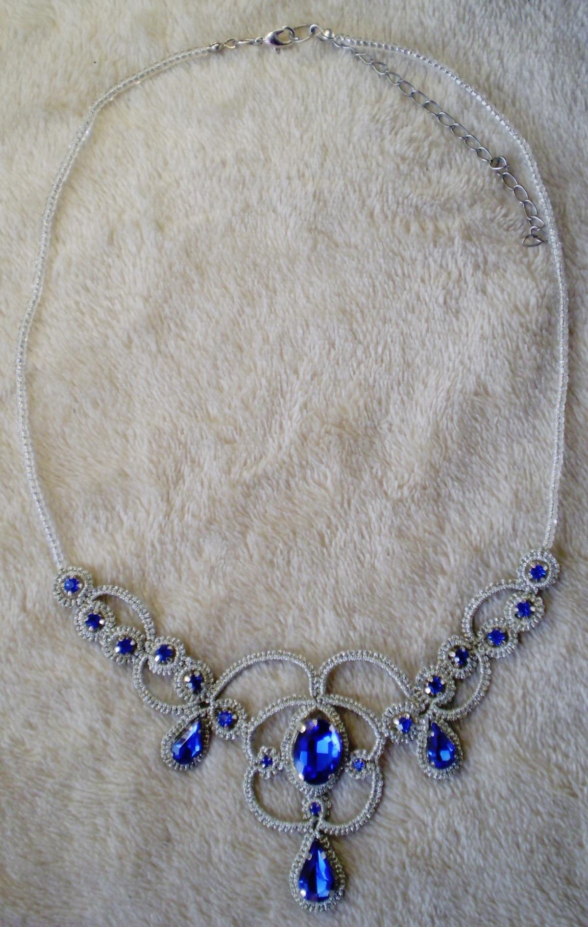 5. Колье. Основа — схема из интернета, но пришлось значительно ее переделать под имеющиеся стразы. Цепочка простецкая из крупного бисера, решила не перегружать и не отвлекать внимание от центральной части.