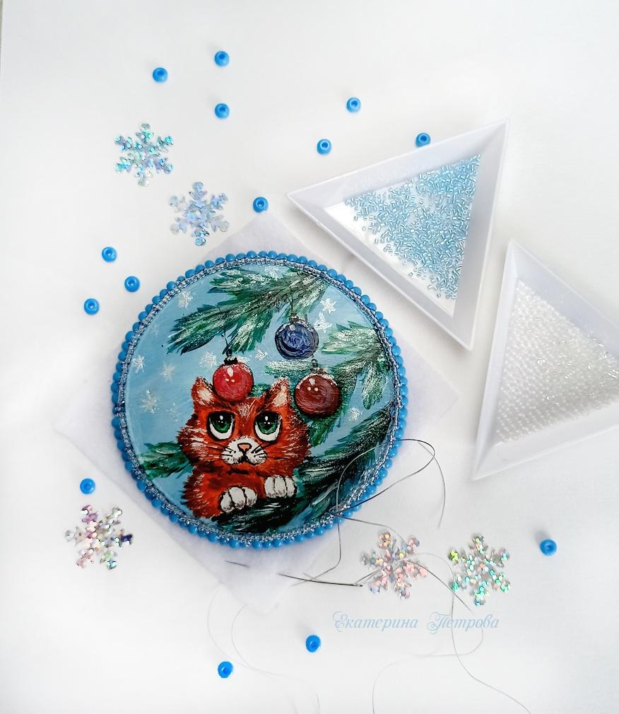 Сначала хотела сделать котика в другой технике, но она более трудоемкая и к Новому году ну не успела бы, а потом родилась такая новогодняя идея, как талисман на счастье в Новом году. Вот и родился у меня вот такой тотемчик — рыжик с зелеными глазами, ему конечно же нельзя лезть на ёлку за заветными ёлочными шарами, но он наперекор идет к своей цели