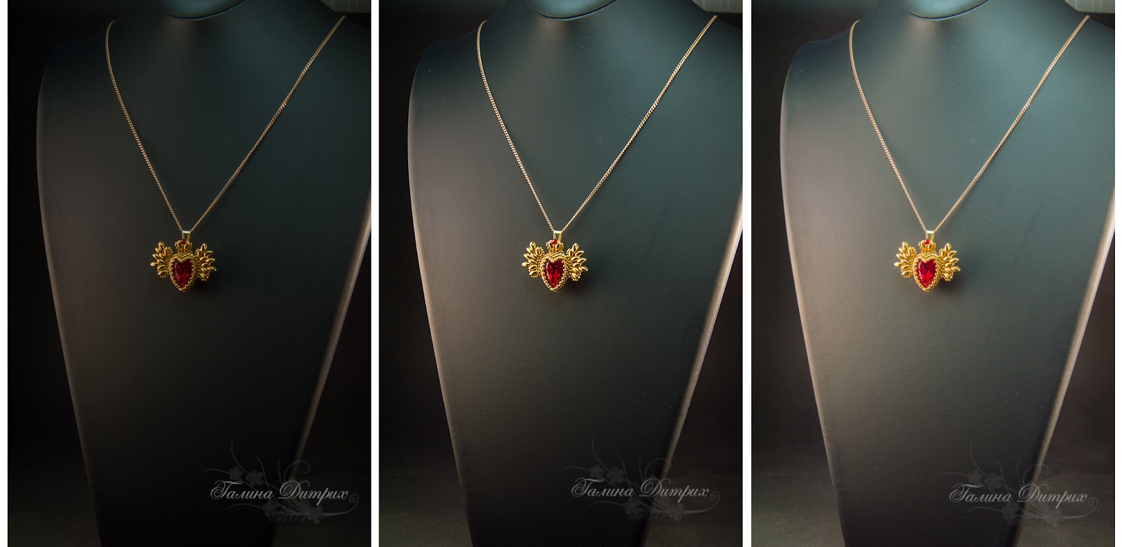 Для общего вида снимаемого объекта (например, крупное колье, снимаемое сверху прямо или по диагонали) желательно сделать резкость одинаково четкой по всему снимку.