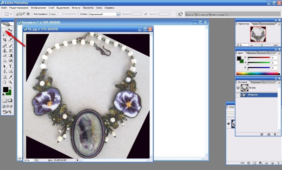 У вас уже два окошка: рабочее и фото украшения. Активируем последнее и выделяем переносимое изображение Кликаем в инструментах выделение и обводим наше фото