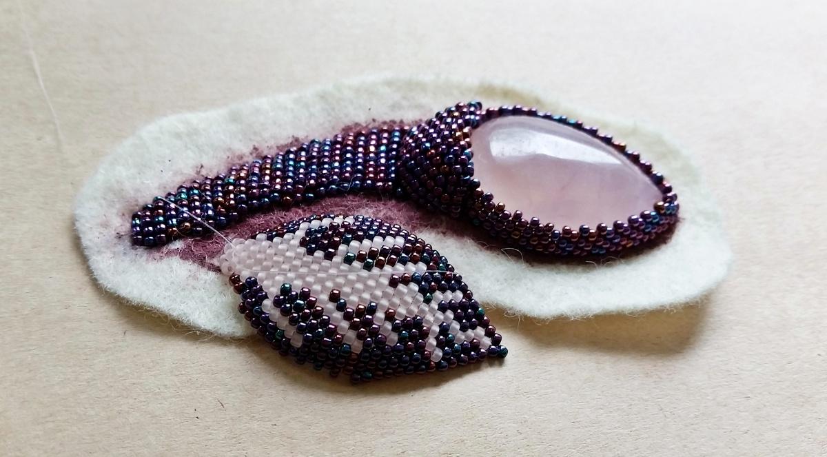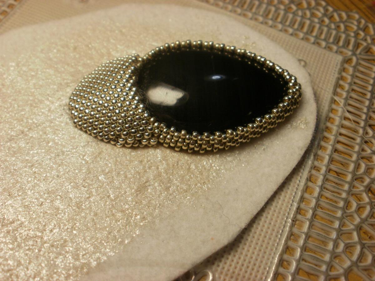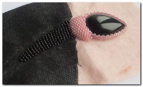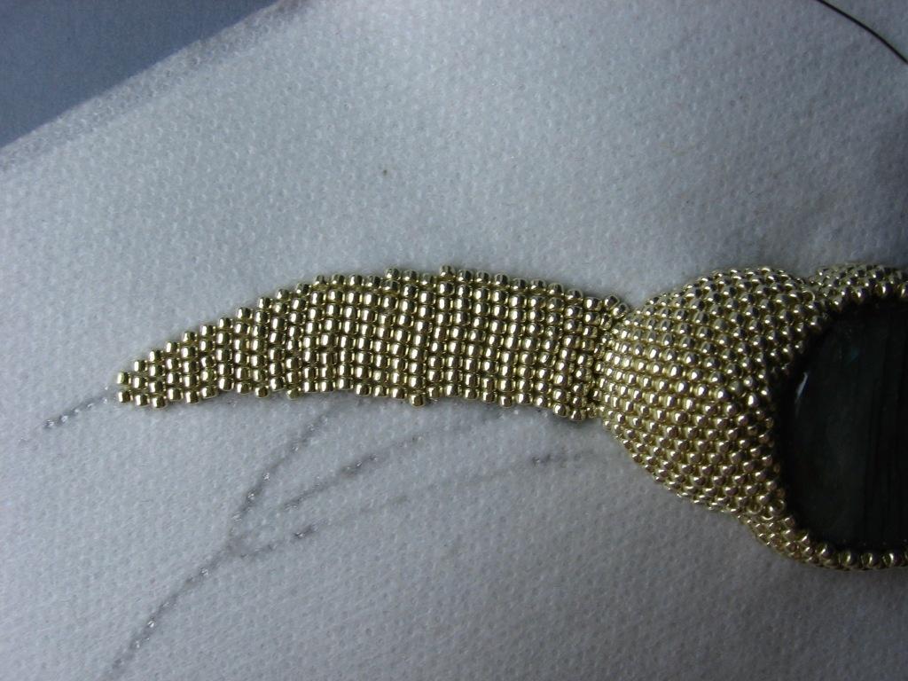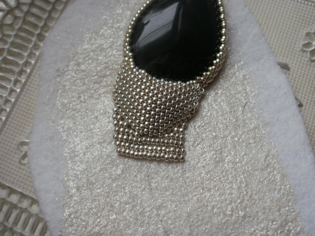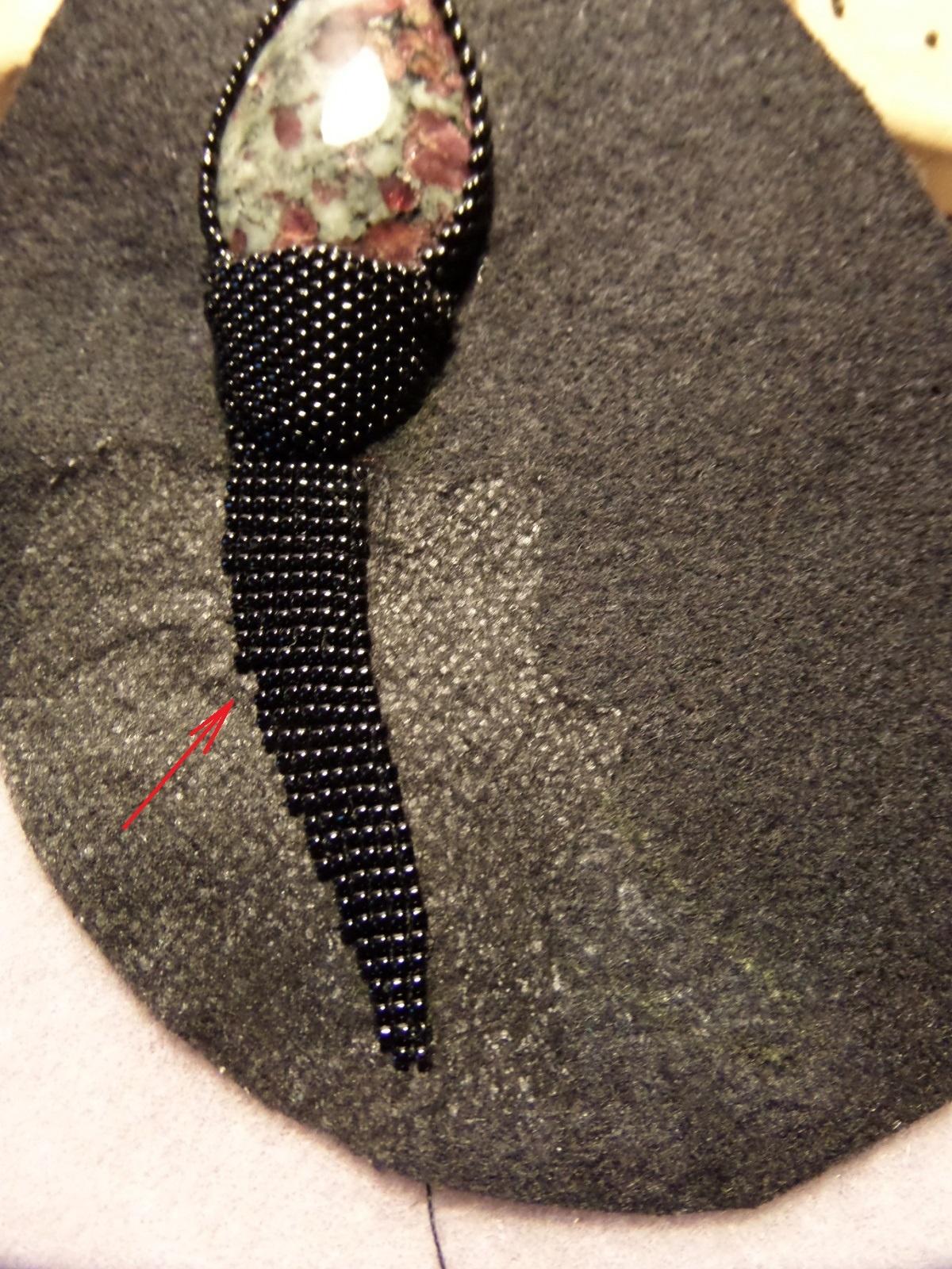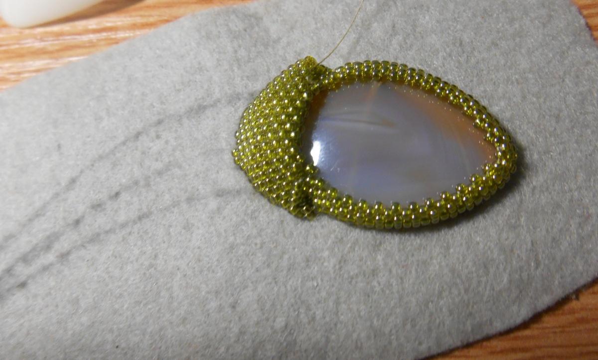 Почему-то никак не могла уловить момент окончания расширения бубочки, к камню всегда подходила с очень широким «Куполом», так и не поняла алгоритм, если только начинать бубочку ближе к камню, чтобы она не успела разростись вширь? А плести бубочку без расширения мозгов не хватило… Пыталась, но без добавления бисерин не получилось.