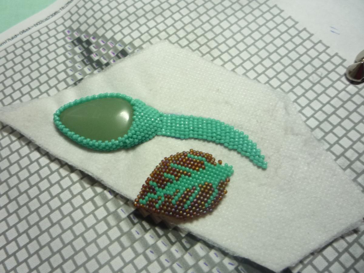 просто нужно было чем-то освежить шарлотку 83, т.к. бисер основной 614, т.е. матовый вариант 83, и вместе в листочке они не смотрятся… А вот прожилки в камне навели меня на мысль использовать приглушенные тона цветного бисера… у правого листочка, что поменьше, в основном топаз и голубой прозр. тертый, а у большого по твоей схеме я просто использовала микс Миюки, не особо следя за тем, что подцепила игла...
