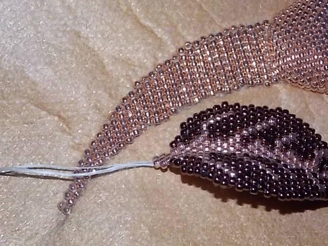 Мало того, я еще и тупенькая оказыватся: начало переплетала дважды — первый раз я поняла описание как одну бусину добавить в конец ряда, а вторую в начало — понятное дело у меня ни фига не вышло… второй раз ориентировалась по фото.