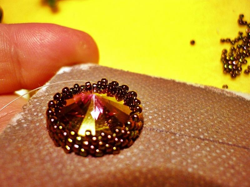цвет риволи и бисера на последнем фото искажен, но вроде четко видно как оплетено