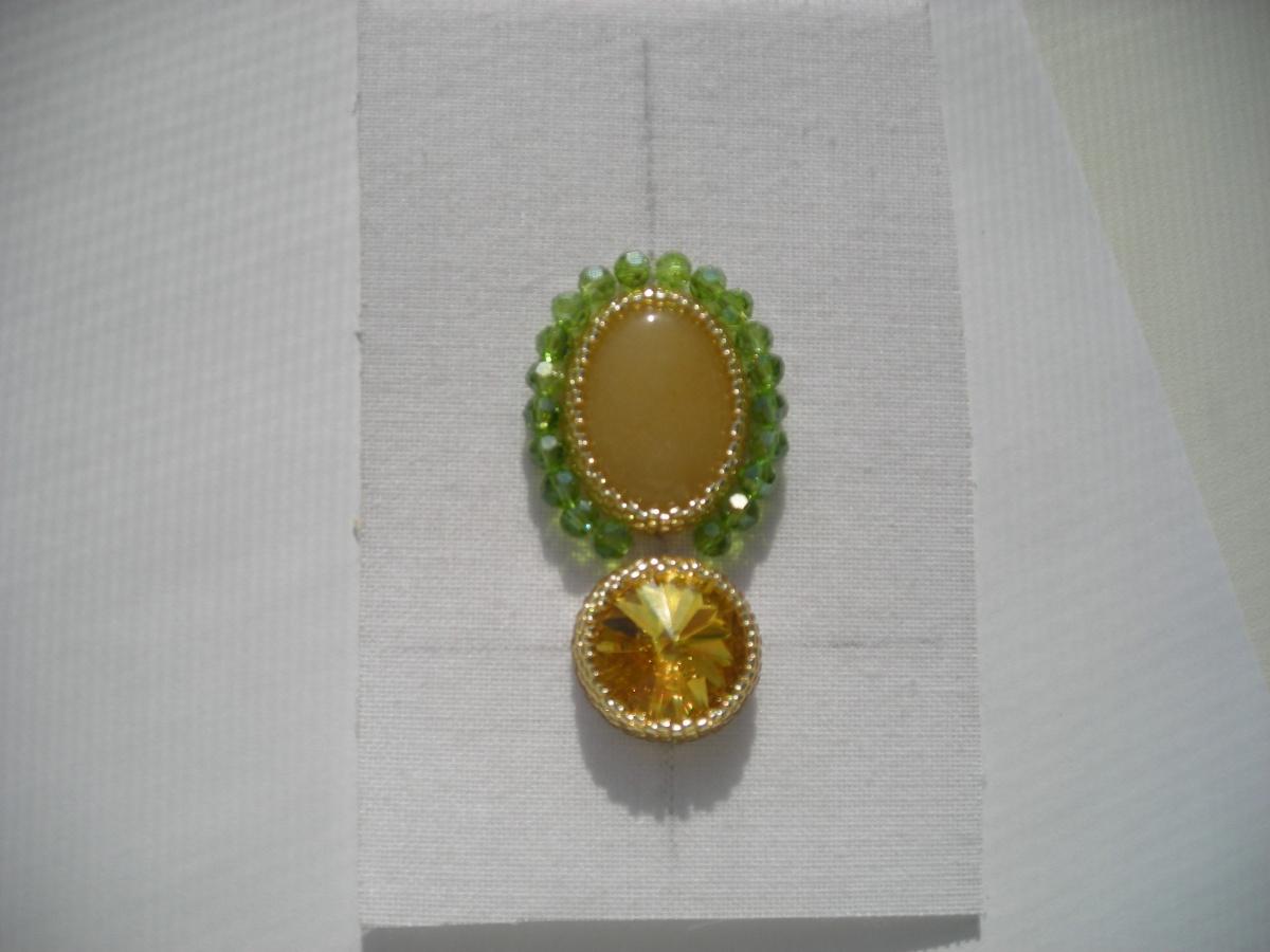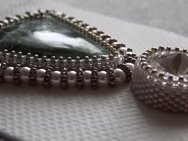 Маша, после листиков по верхнему краю кабошона пришью бусины. Стразовая лента отказалась сотрудничать с кабошоном