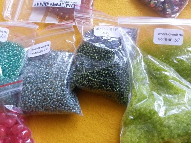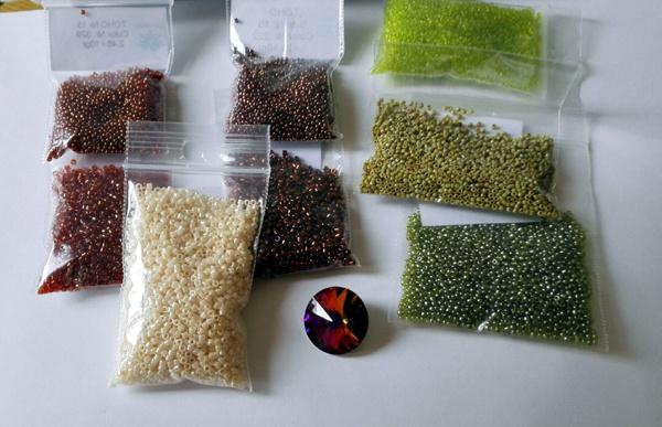 Бусины, конечно, тоже есть. Буду подбирать их по ходу дела. В верхнем ряду делика, в нижнем — Тохо 15. Цвета, возможно тоже немного изменю, но пока так