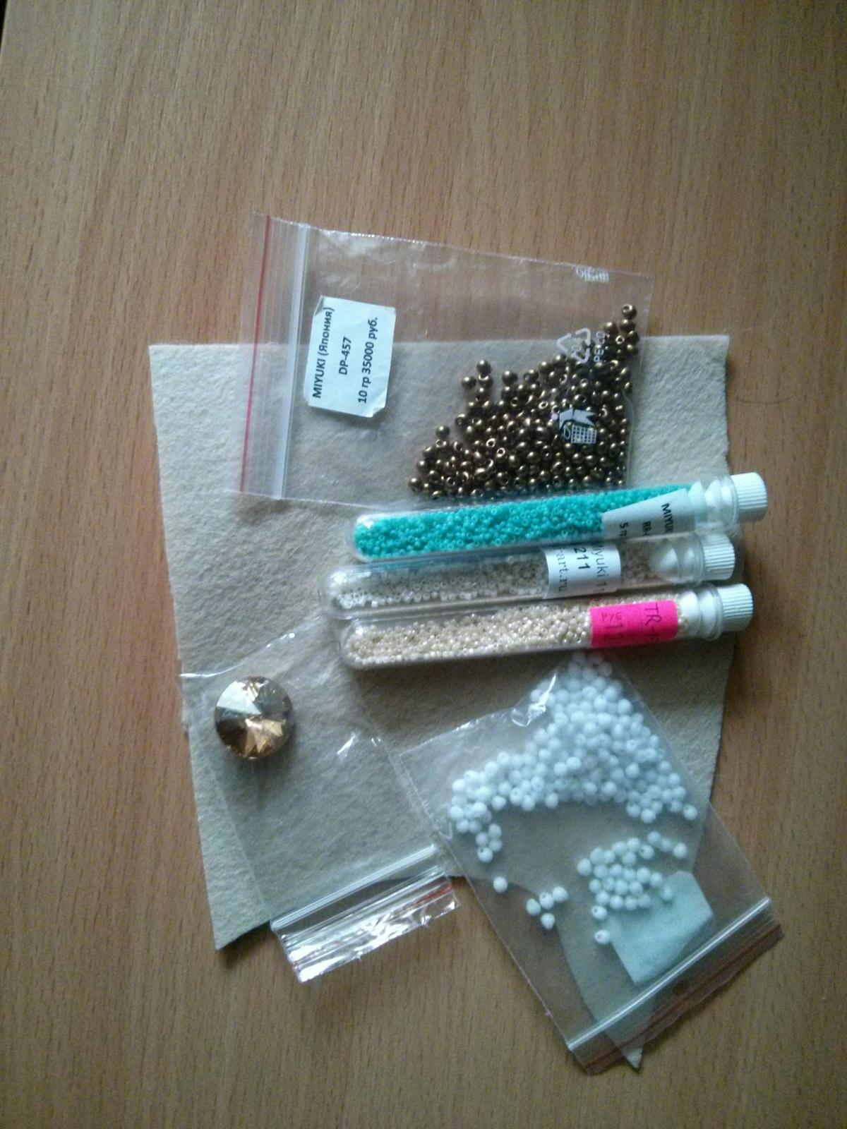 Вот мой набор материалов. Оливковым бисером буду плести листики. Снизу набор бисера с деликой — для лепестков. Возле риволи делика с пятнашкой — для риволи. Застёжка 2,5 см. если маленькая — куплю, не вопрос. Фетр чёрный, тёмно-серый или коричневый. Коричневый вышел на фото слишком бежевым — на самом деле он слегка с фиолетовым отливом, хоть и коричневый. Но наверное всё таки на чёрном остановлюсь — всё таки тёмно-фиолетовый близко к чёрному.