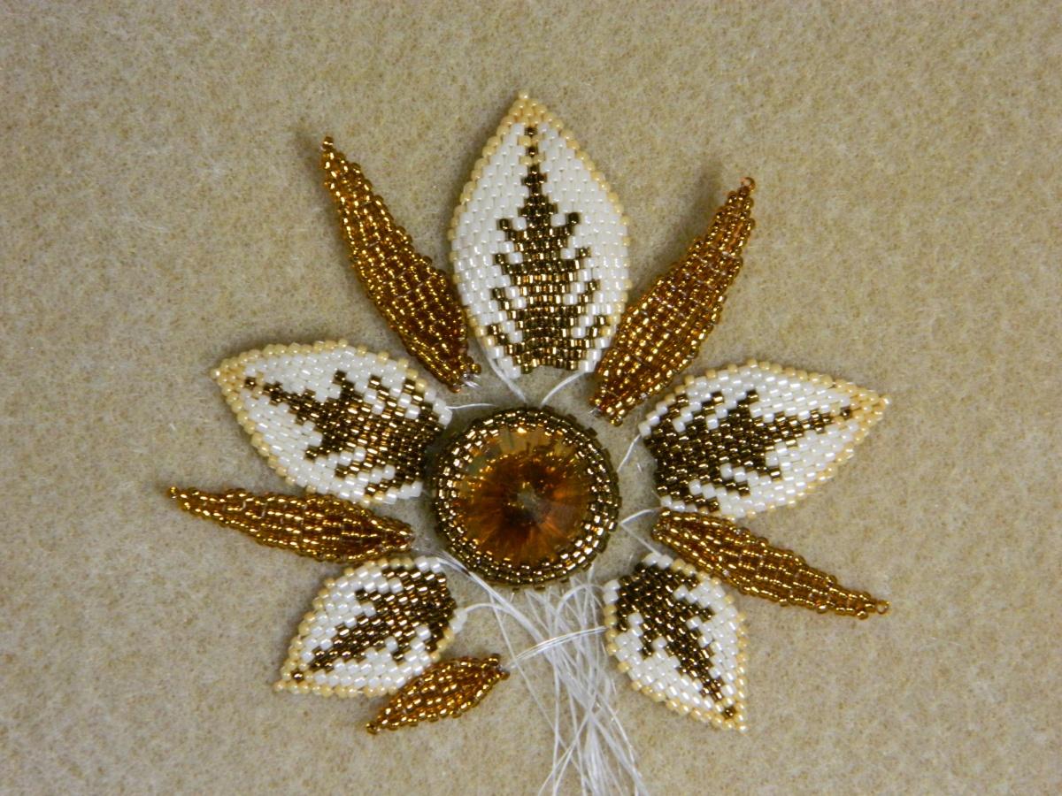 И если честно мне с жёлтенькой серединкой нравится больше — с кристаллом, который потемнее, цветок сливается в одно сплошное пятно. Если на бахроме оттенить этот жёлтенький, будет просто волшебно!)