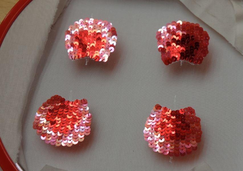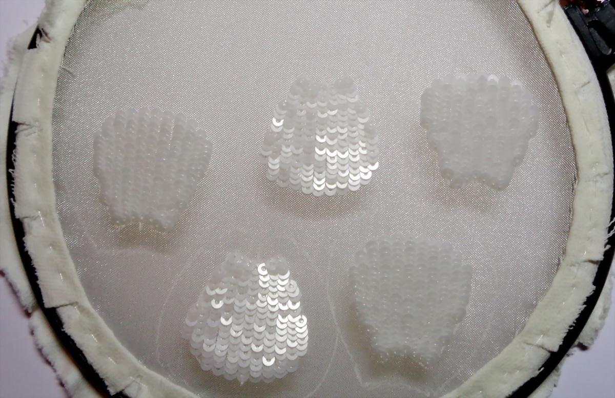 и еще очень далеко пришиваешь следующую пайетку — дырочки видны целиком, да еще часть пайетки ниже дырочки видна