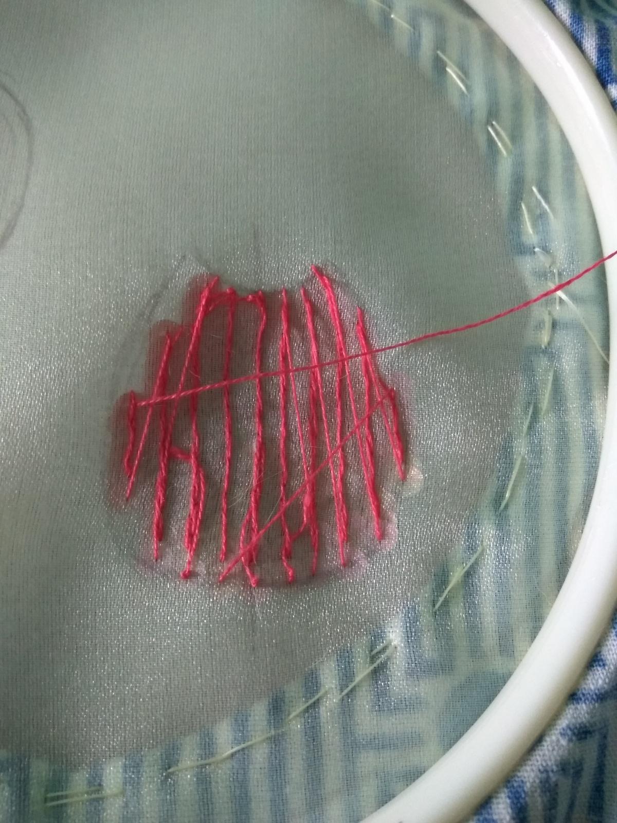 Вообще сегодня даже с подбором материала безостановочно идет урок из серии век учись. Начала первый лепесток мулине дмс, и только когда начала шить поняла, что у меня не шелковые а 100%хлопок. Тяжело шла работа. Сменила нитку на шелковую-быстро все закончила. То же и с шаблоном. Сделала побольше один и поменьше другой, пока переводила, дорисовала им по своему разумению острые рожки внизу, сижу шью и удивляюсь себе: зачем они вообще нужны, че меня дернуло их удлинять…
