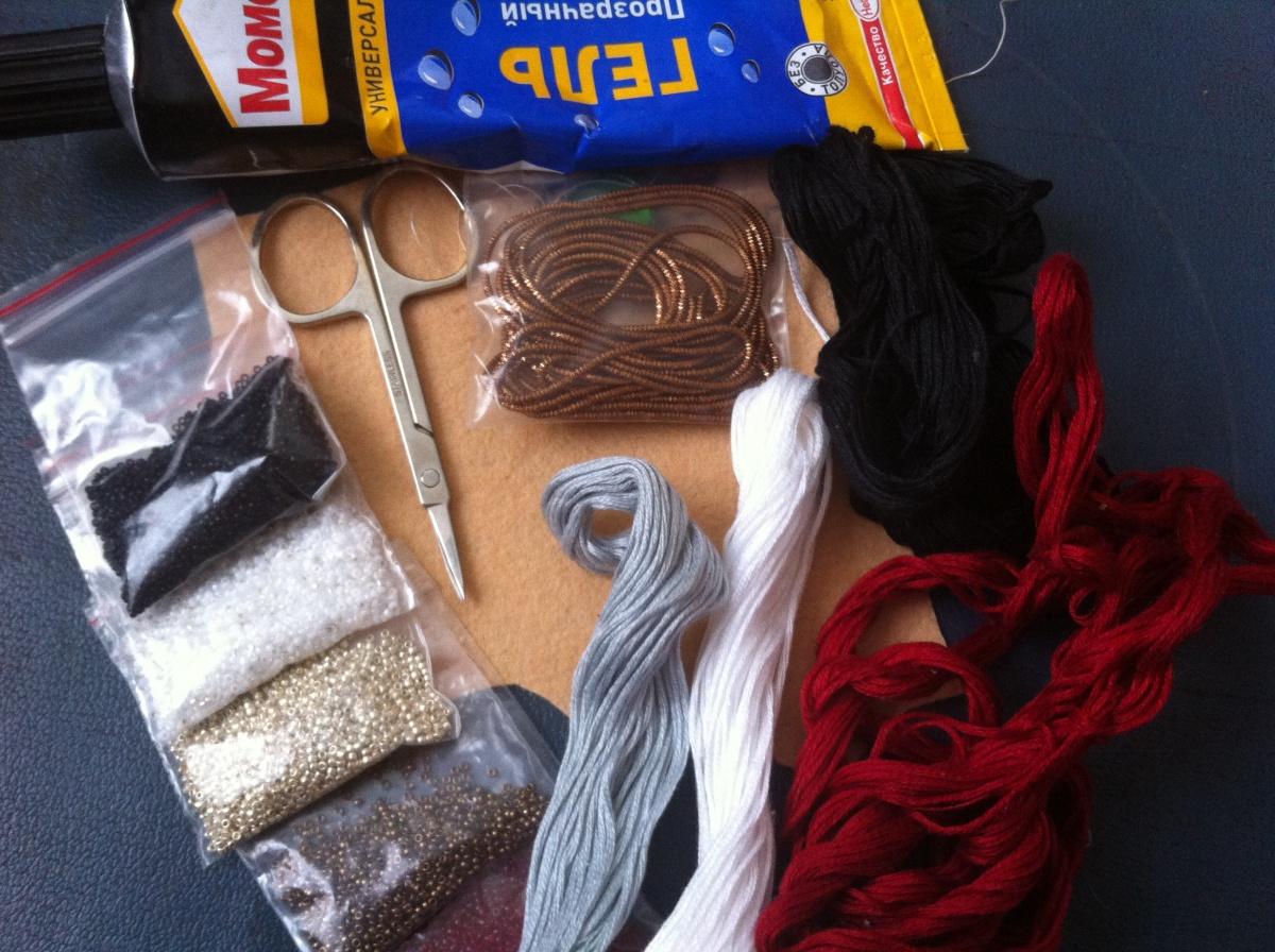 11. Бисер японский 15/0 (можно использовать миксы). Цвета — черный, серый, белый, красный, бронза (под дерево). Количество — совсем по чуть-чуть, для заделочного ряда. 1 бусина черного цвета 4мм (крупная бисеринка, жемчужина сваровски, граненая чешская — любая для глазика).